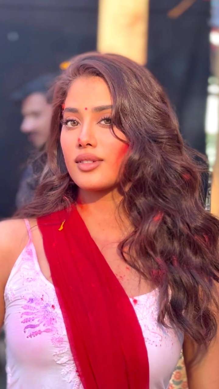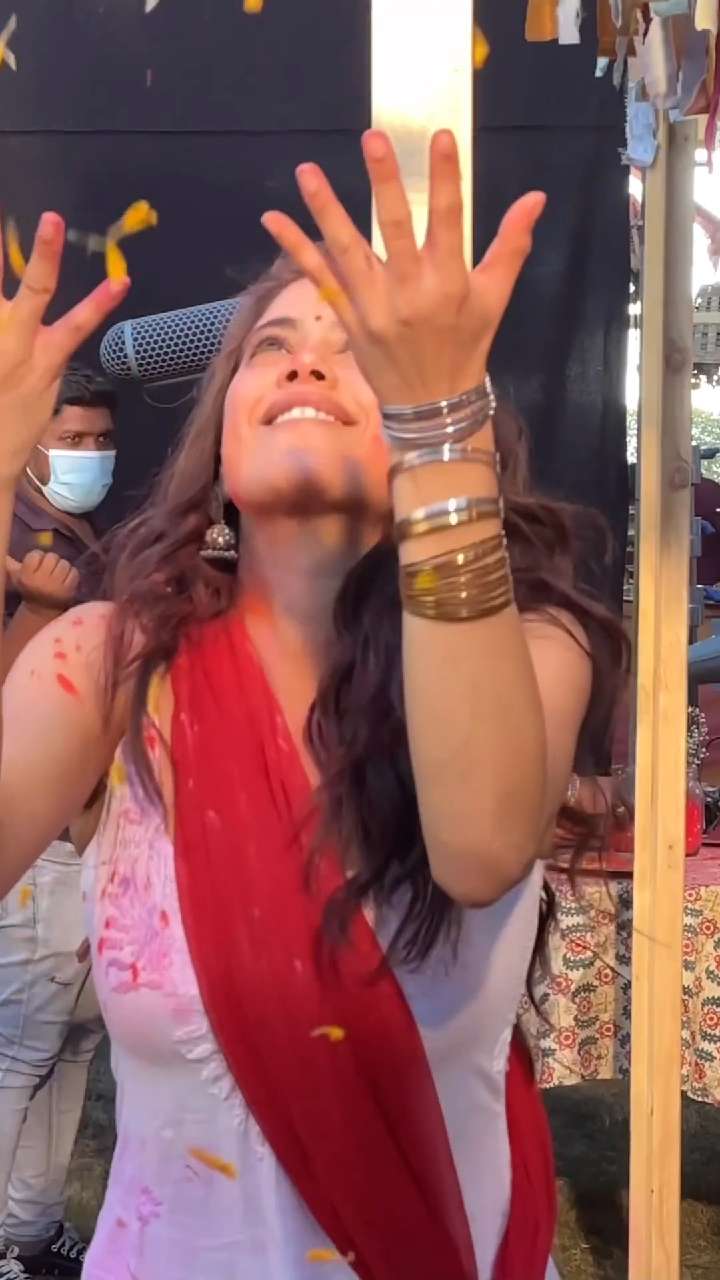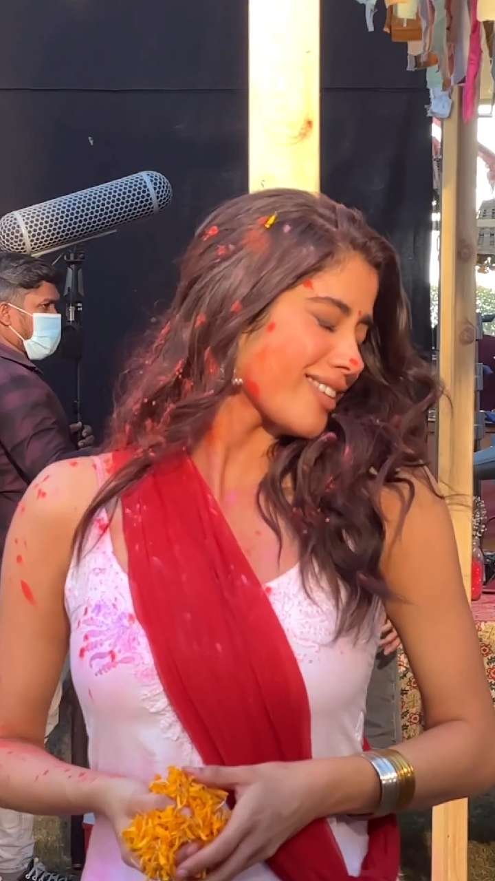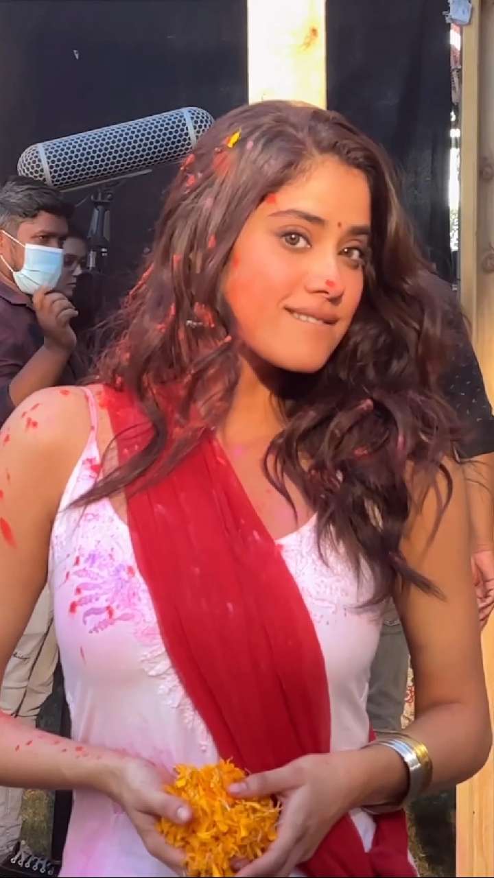 जाह्नवी तस्वीर में फुल उड़ाते जनवरी महीने में ही होली सेलिब्रेट करती नजर आ रही है।