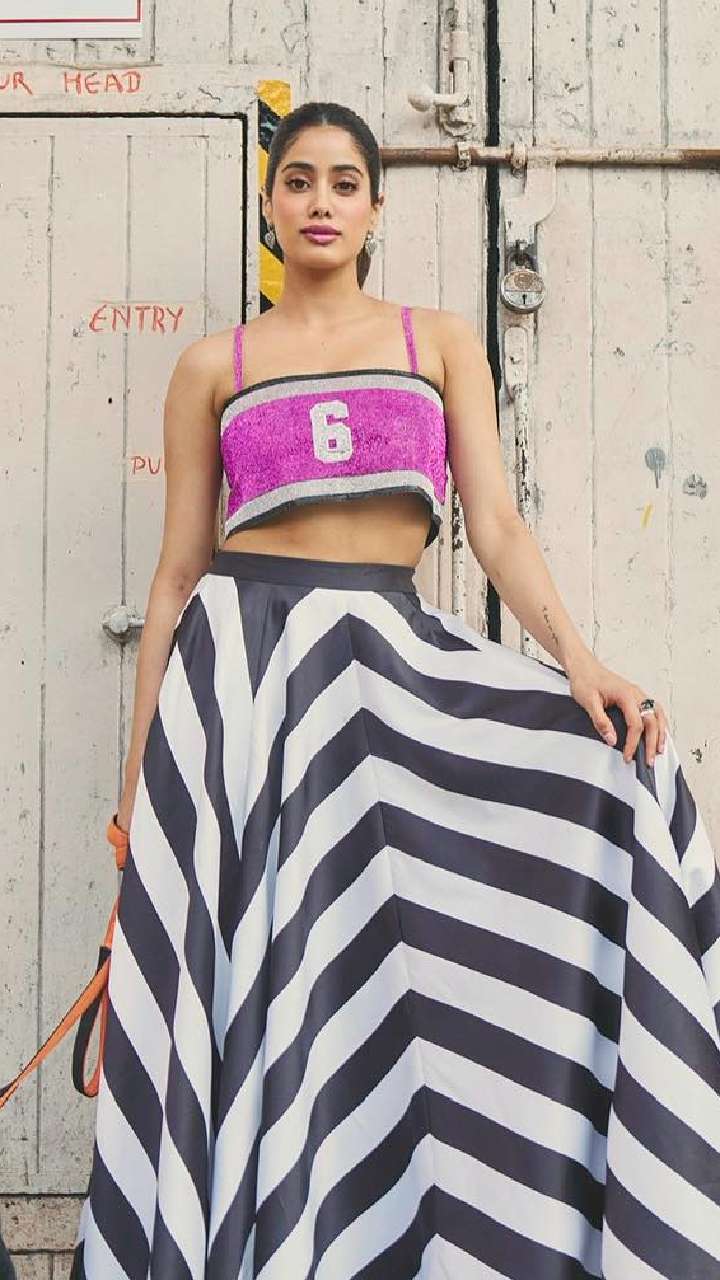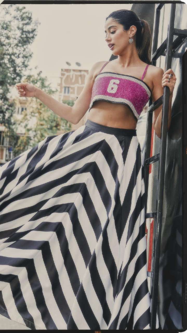 हाल में जान्ह्ववी ने ब्लैक इन व्हाइट स्कर्ट नूडल स्ट्रैप शिमरी पिंक कलर के क्रॉप टॉप में हॉट लुक शेयर किया है। जो कि समर परफेक्ट है।
