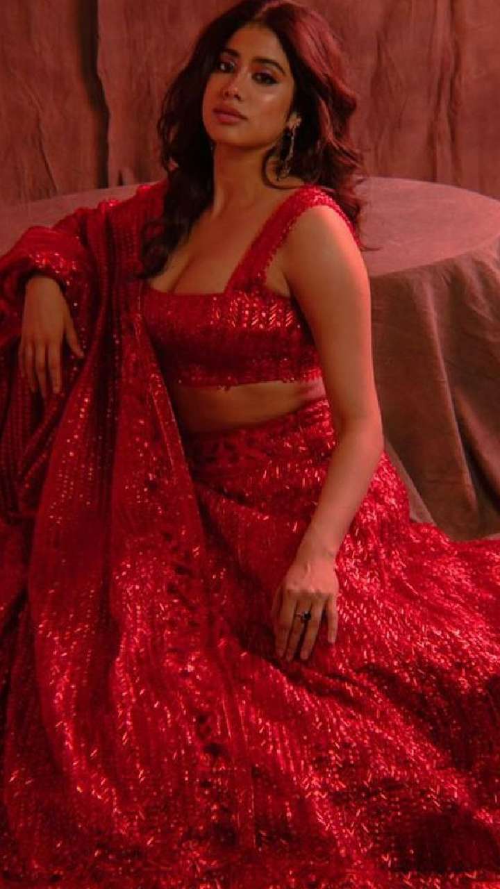 रेड कलर के इस लहंगे में जाह्नवी कपूर ने अपने लुक से सबको दीवाना बनाया।