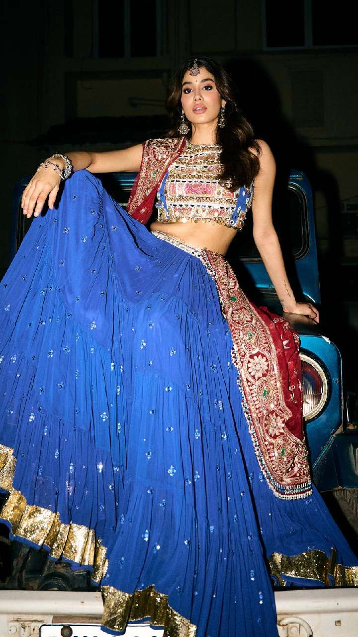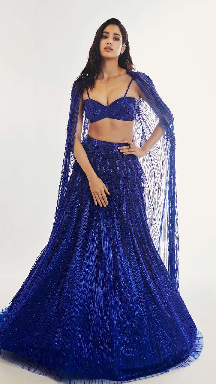 जान्ह्ववी इस ब्लू कलर के ग्लिटरी फ्लेयर लहंगा नूडल स्ट्रैप चोली में काफी प्रिटी अंदाज में नजर आ रही हैं।