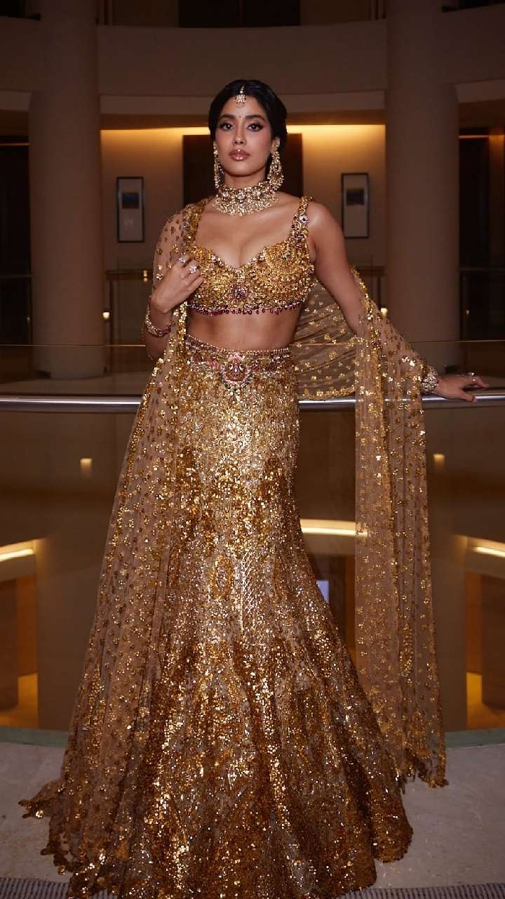 अगर आप अपने लुक को सबसे ज्यादा खास बनाना चाहती हैं तो आप जाह्नवी कपूर की तरह ही गोल्डन लहंगा स्टाइल कर सकती हैं।