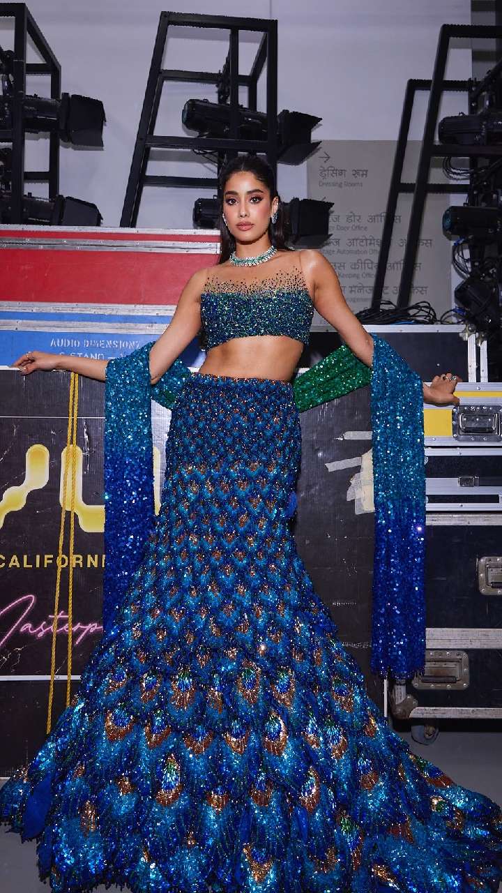 जाह्नवी कपूर का ये लहंगा लुक काफी शानदार लग रहा है। इस लहंगे में मोर के पंख का डिजाइन बना हुआ है।