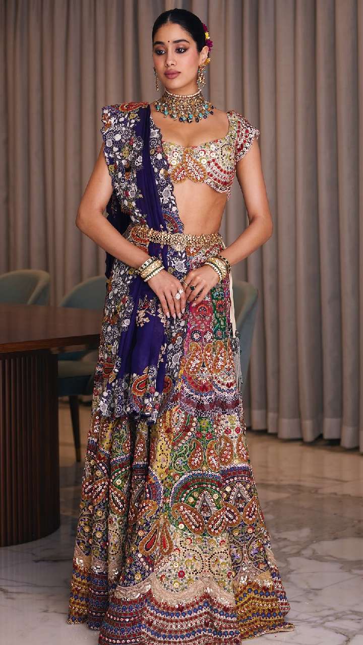आप अपने लुक को अट्रैक्टिव बनाने के लिए जाह्नवी कपूर की तरह ही मल्टी कलर मिरर वर्क लहंगा पहन सकती हैं।
