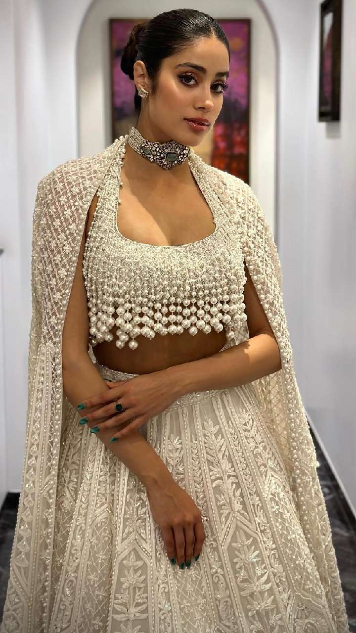 Janhvi का यह लहंगा देखने में रॉयल लुक दे रहा हैं। आप लहंगे को हैवी सिल्वर ज्वेलरी के साथ स्टाइल करके अपने लुक में चार-चांद लगा सकती हैं। साथ ही, टाइट बन हेयर स्टाइल आपके लुक को गॉर्जियस बना देगा।