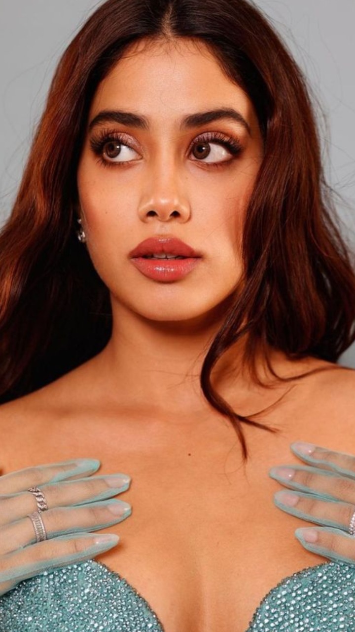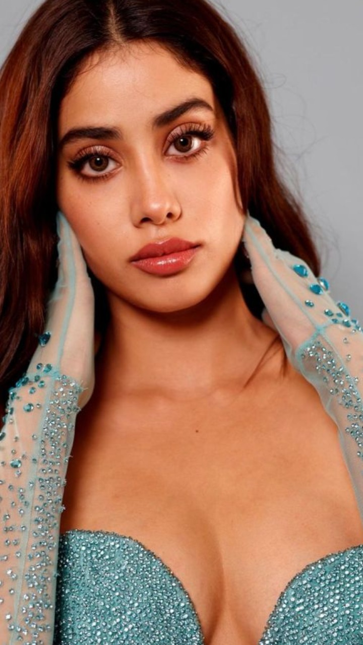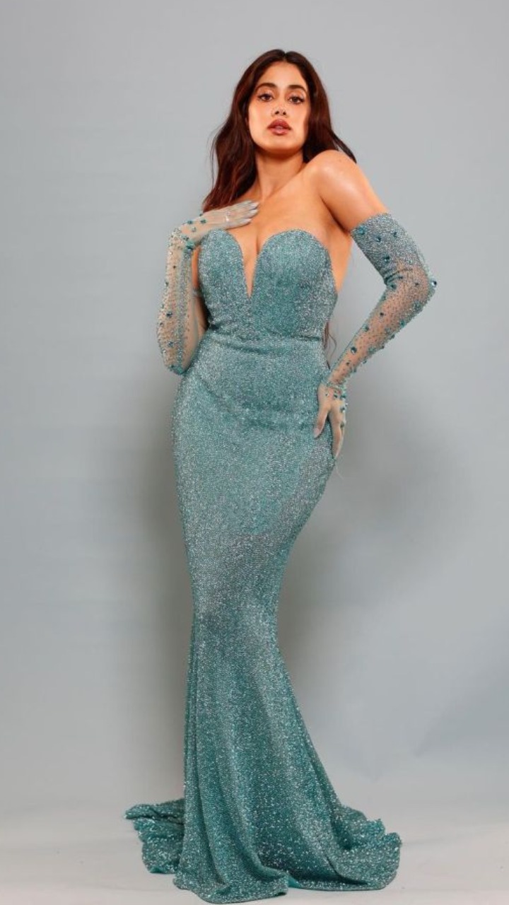 तस्वीर में जाह्नवी ने ब्लू कलर की ऑफ शोल्डर सेक्विन मरमेड ड्रेस पहनी हुई है।