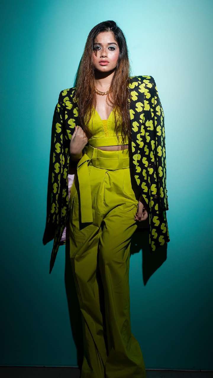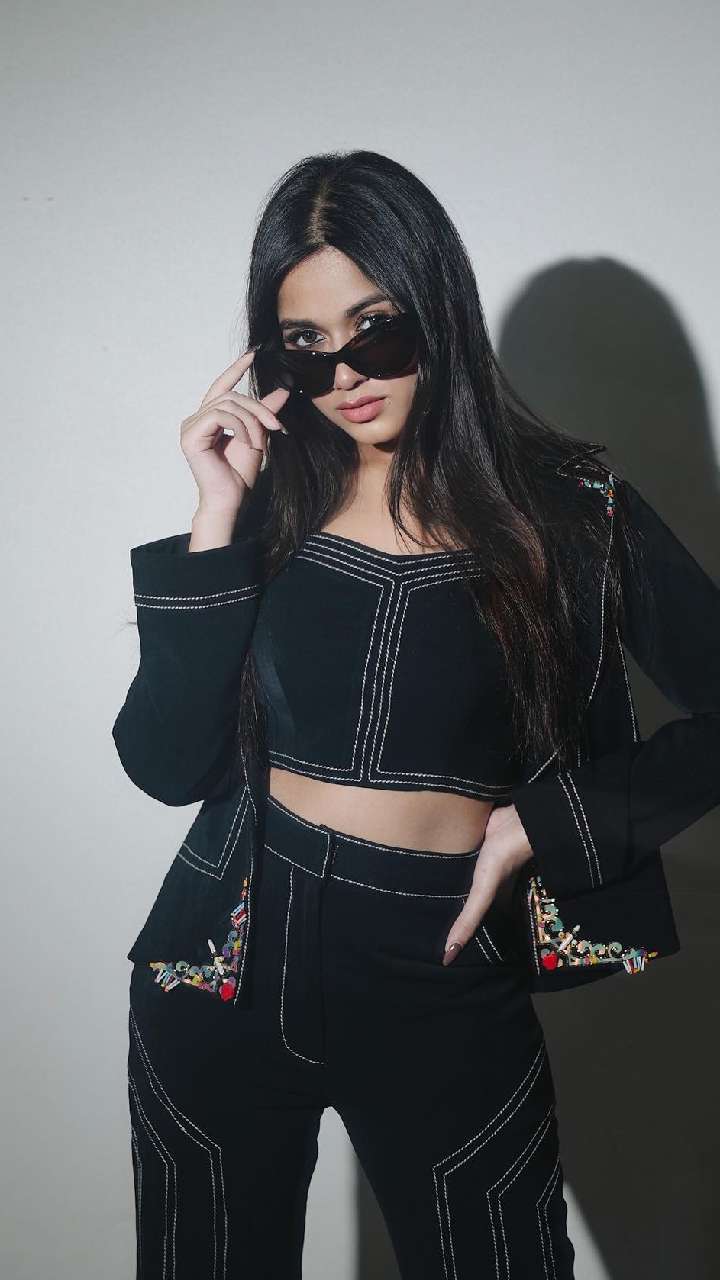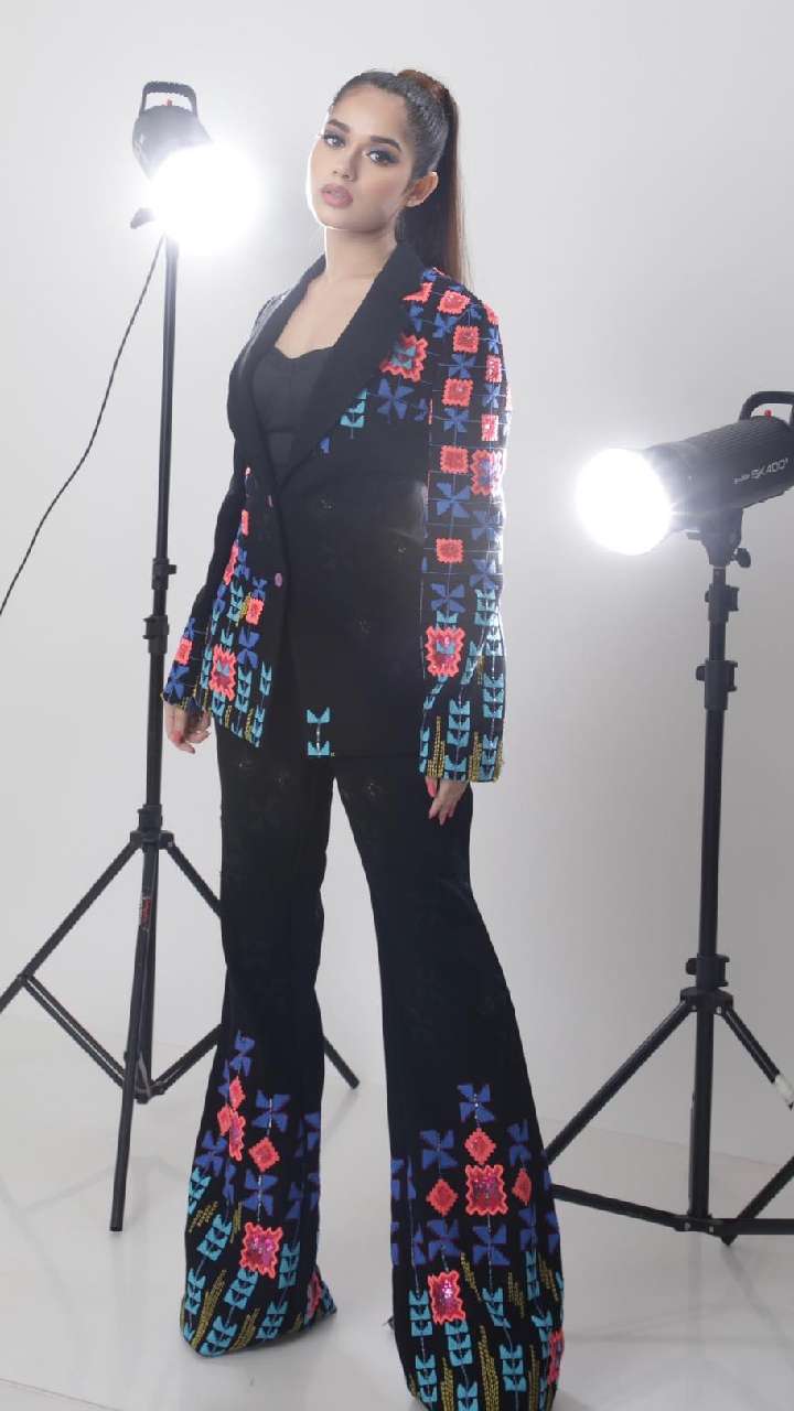 जन्नत जुबैर का ये मल्टीकलर ब्लेजर विद बेल बॉटम पेंट और टॉप में बॉसी लुक शानदार है।