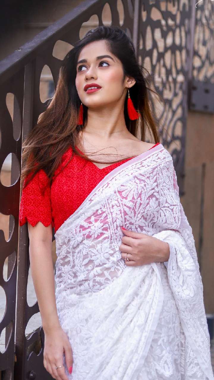 एक्ट्रेस का व्हाइट चिकनकारी साड़ी विद रेड चिकन कढ़ाई ब्लाउज काफी एलिगेंट लुक दे रहा है।