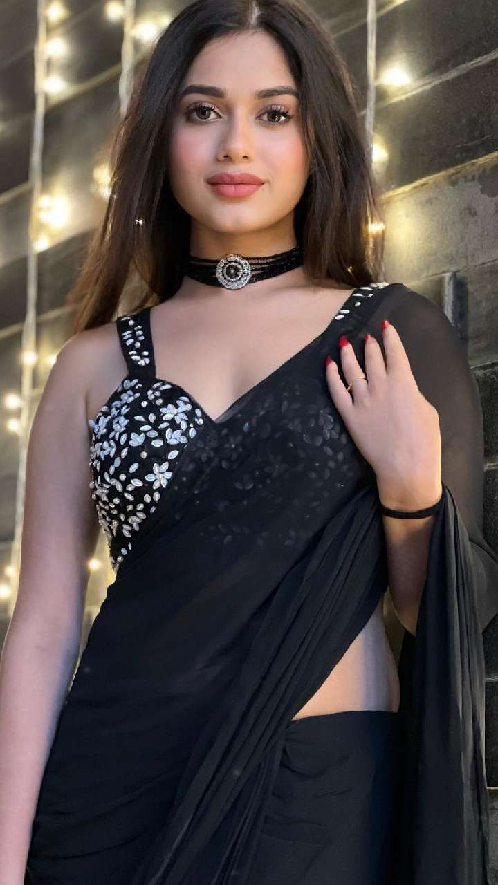प्लेन ब्लैक साड़ी हेवी वर्क ब्लाउज विद चोकर नेकपीस में एक्ट्रेस माशाअल्लाह हुस्न की मल्लिका लग रही हैं।