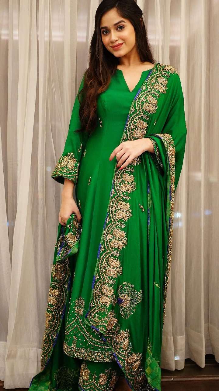 मेहंदी सेरेमनी में जन्नत का ग्रीन ए लाइन गोल्डन एम्ब्रॉयडरो सूट आपके लिए बेस्ट रहने वाला है।