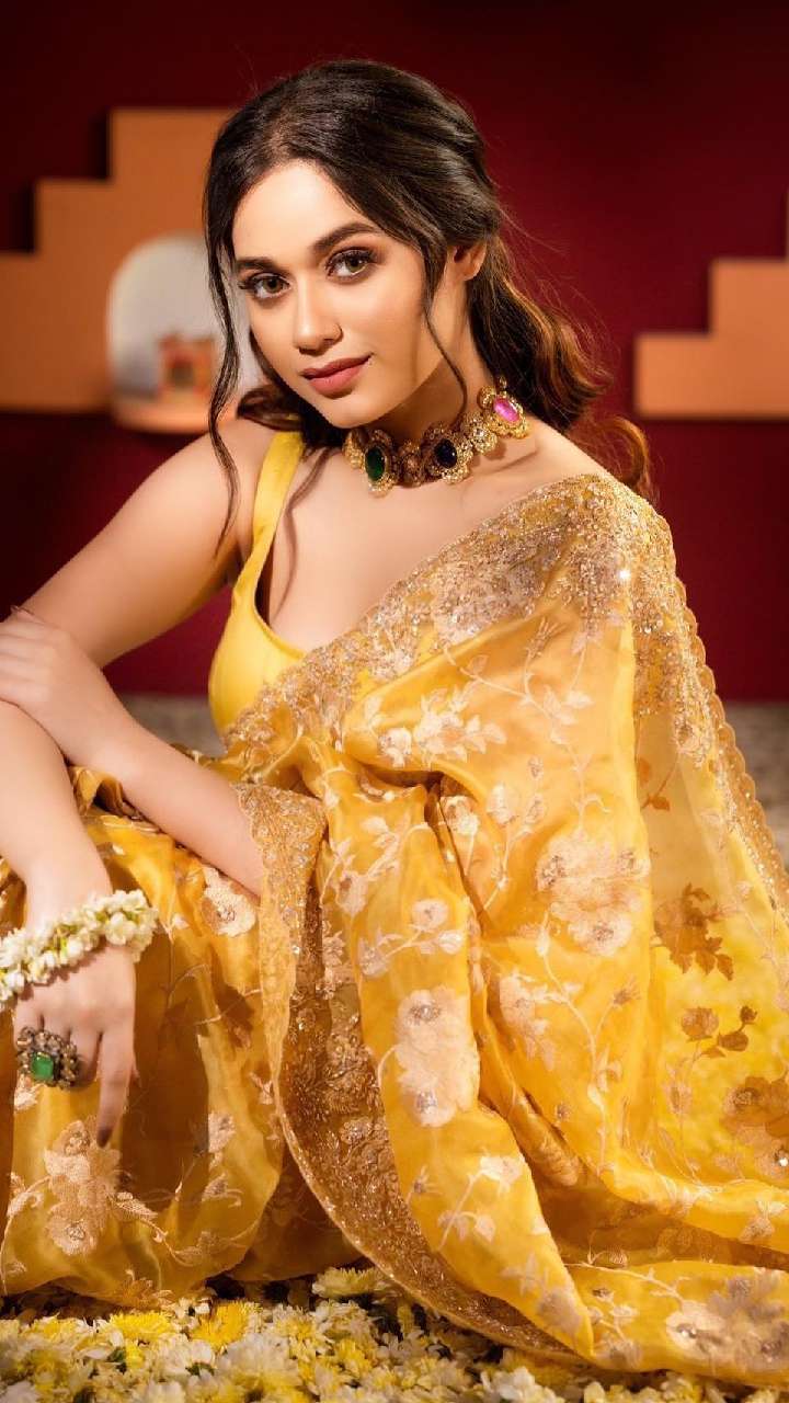 इस वेडिंग सीजन ब्राइडल या कोई और भी जन्नत के येलो सिल्क साड़ी हाफ कर्ल हेयर स्टाइल विद गजरा लुक को कॉपी कर सकती हैं।