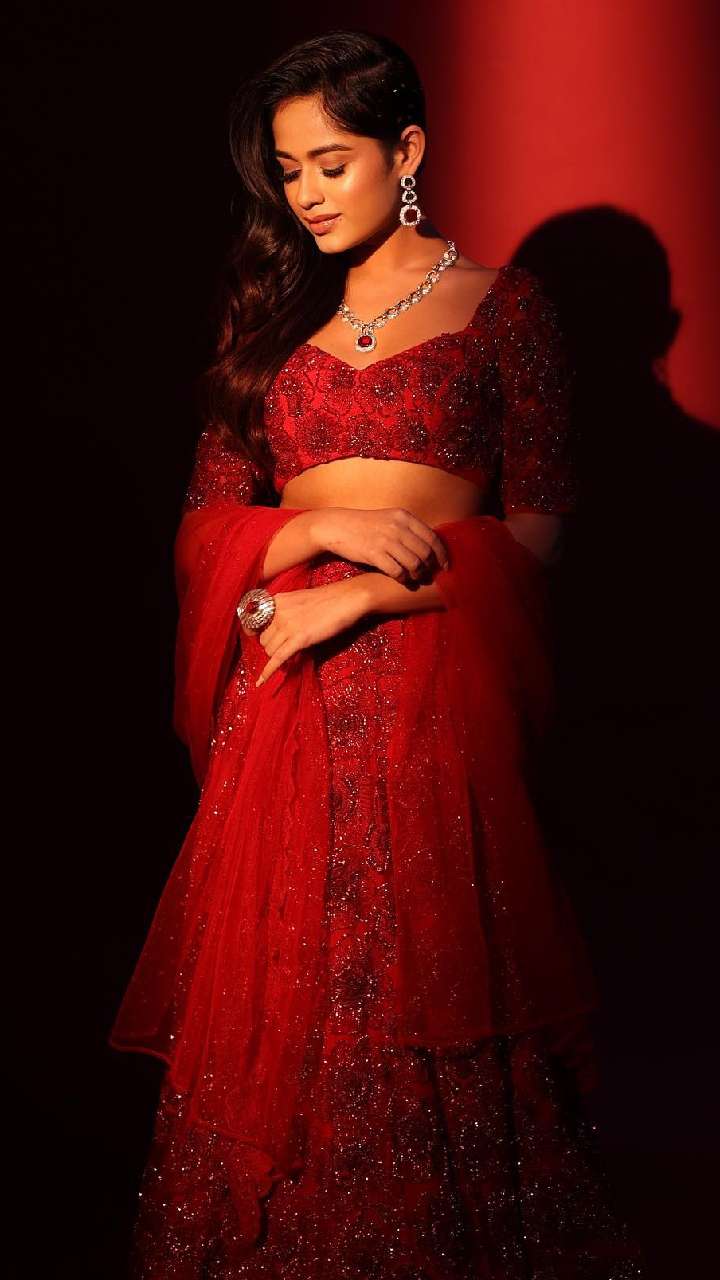यदि आप रिसेप्शन में एकदम डिफरेंट और अट्रैक्टिव दिखने का सोच रही हैं तो जन्नत के इस ऑल रेड लहंगे विद मैचिंग नेकपीस और ग्लॉसी मेकअप टच दे सकती हैं।