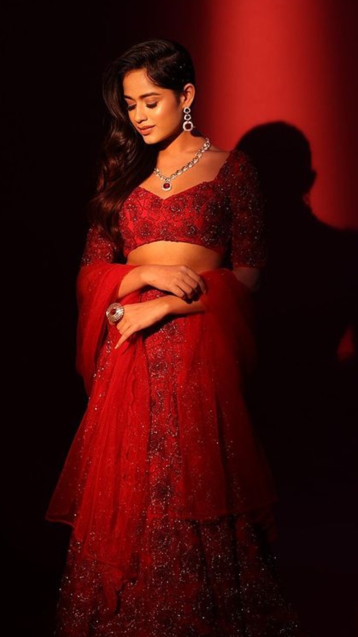 जन्नत इस रेड शिमरी लहंगे में अप्सरा सी खूबसूरत दिख रही हैं।