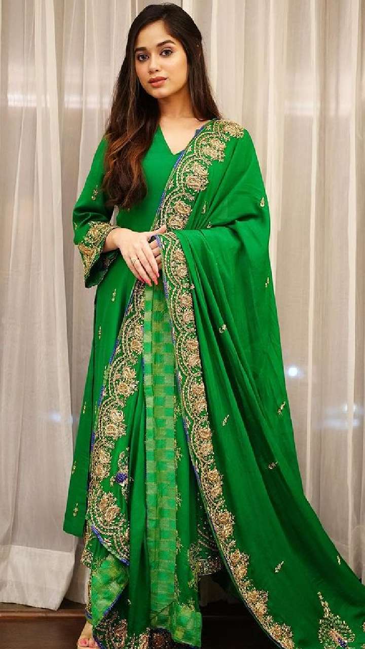 डीवा इस ग्रीन कलर के गोल्डन वर्क वाले सूट में कहर ढहा रही हैं।
