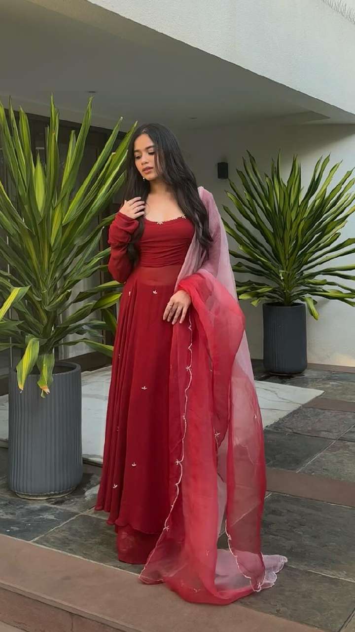 यंग गर्ल्स पर इस तरह की जॉर्जट सूट भी स्टाइल कर सकती हैं। जन्नत जुबैर का ये आउटफिट भी शानदार लग रहा है।