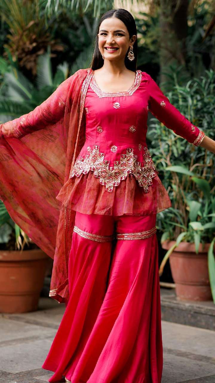 आप भी जैस्मिन की तरह साटन पेंट सूट से खुद को ब्यूटीफुल बना सकती हैं। ये आपको काफी स्टाइलिश लुक देगा।