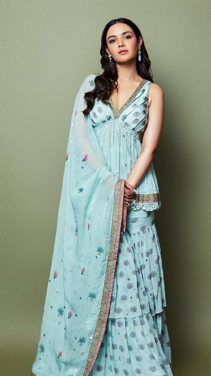 एक्ट्रेस ब्लू कलर के गोल्डन वर्क प्लाजो सूट में कयामत ढहा रही हैं। उनका ये लुक आप भी ट्राई कर सकती हैं।