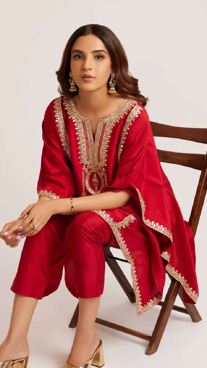 अभिनेत्री ने हाल में इंस्टाग्राम पर रेड कलर के काफ्तान स्टाइल साटन को-ऑर्ड सेट में अपना लेटेस्ट लुक शेयर किया है। जिसपर गोल्डन सितारा वर्क किया गया है।