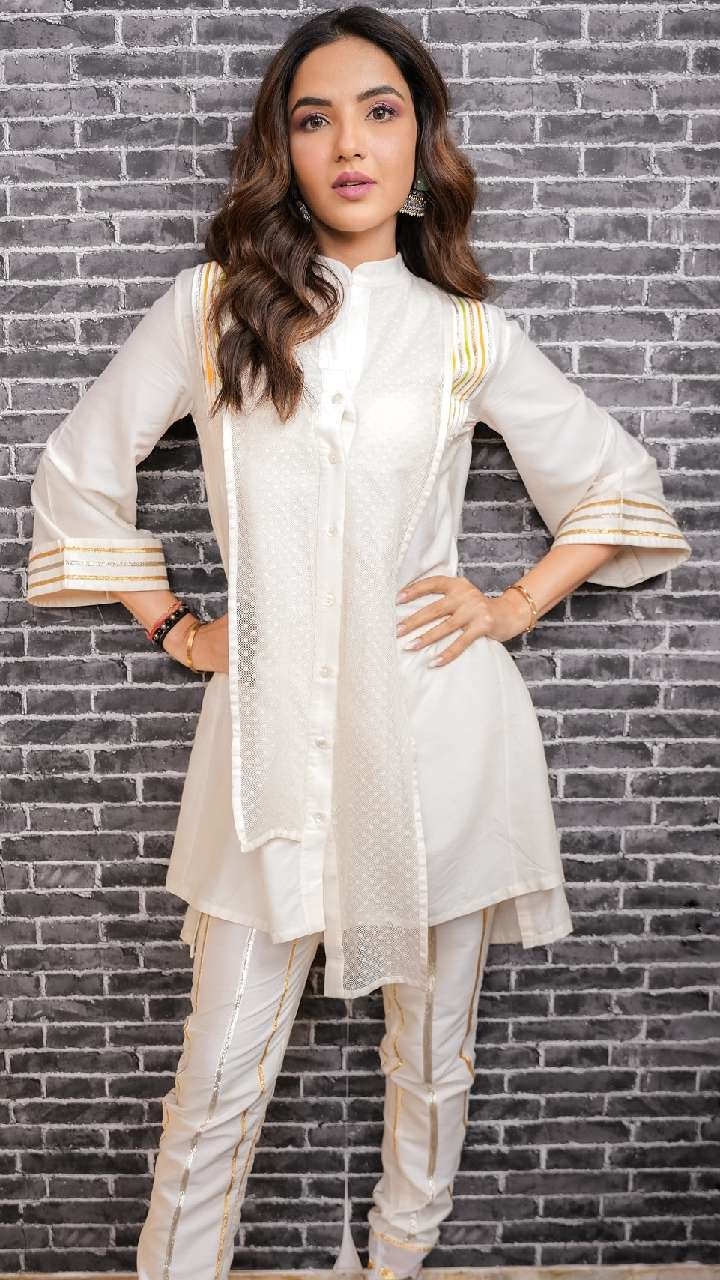 जैस्मिन का व्हाइट गोटा वर्क जीरो नेक को-ऑर्ड सेट काफी स्टाइलिश लग रहा है। इसके साथ उन्होंने ऑक्सीडाइज झुमकों से अपना लुक कंप्लीट किया है।