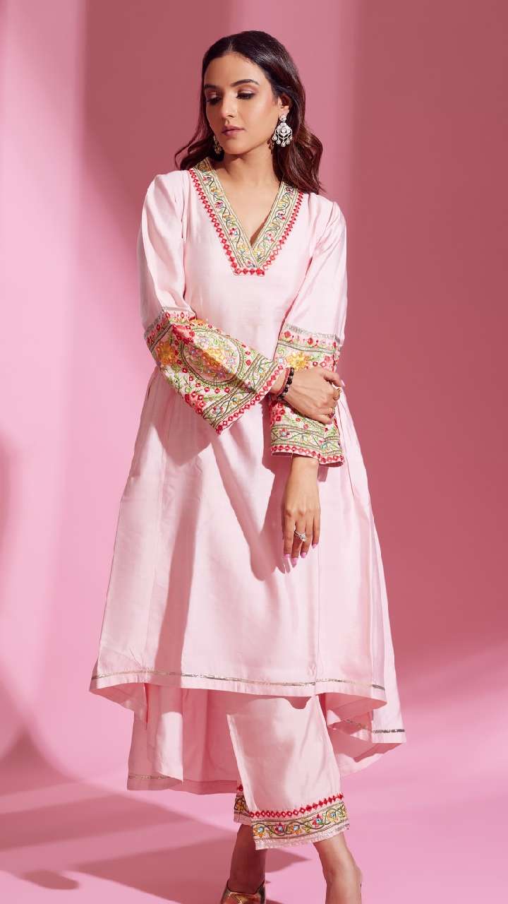जैस्मिन भसीन का पिंक व्हाइट ब्रॉड एम्ब्रॉडयरी वाला को-ऑर्ड सेट भी शानदार लग रहा है। इसमें यंग गर्ल्स स्मार्ट दिखेंगी।