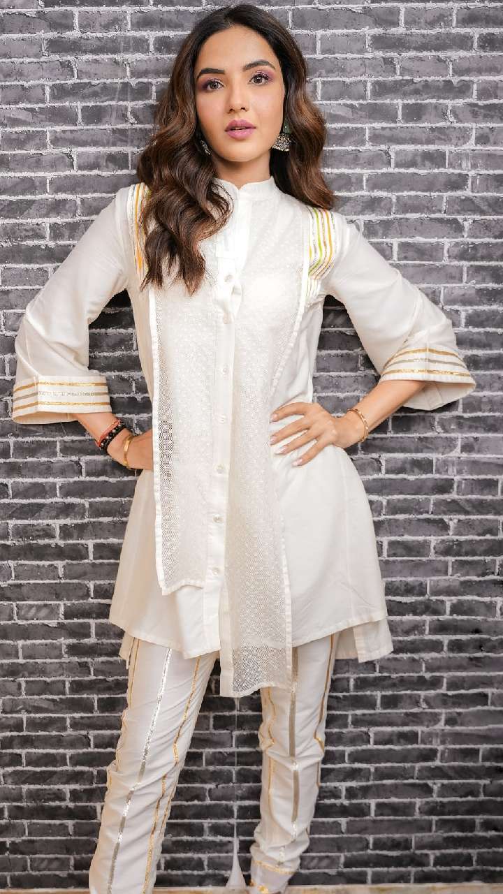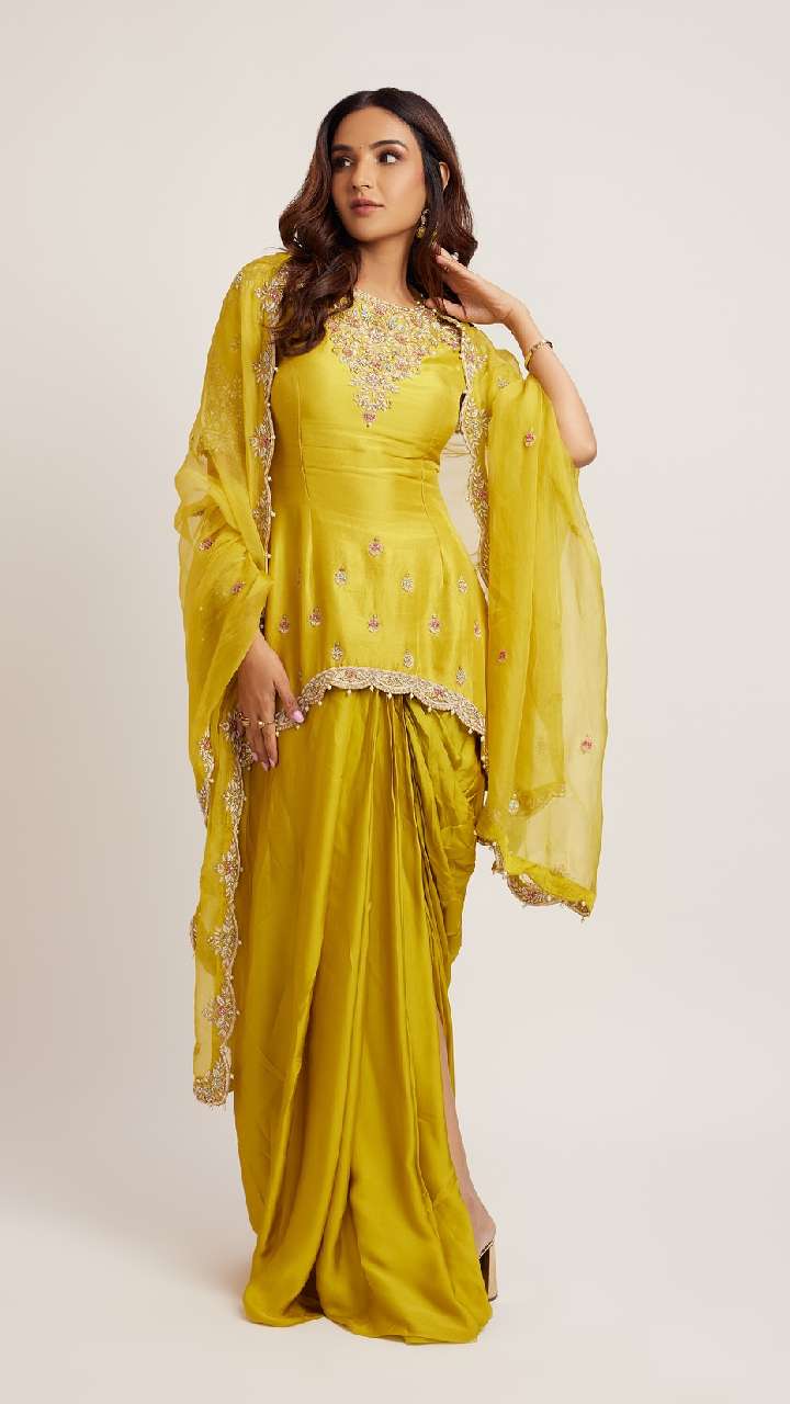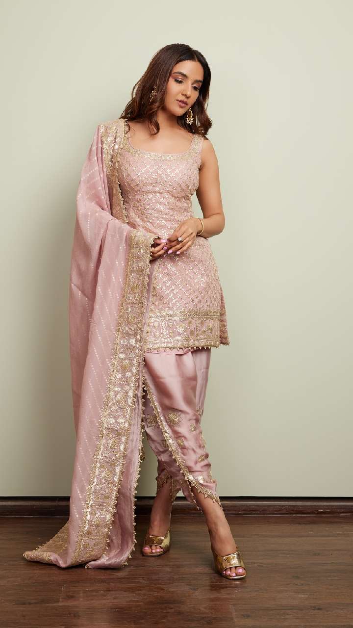 अगर आप अपने लुक को डिफरेंट बनाना चाहती हैं तो आप जैस्मिन के इस लुक को रिक्रिएट कर सकती हैं। एक्ट्रेस का ये धोती स्टाइल सूट आपके लुक में चार चांद लगा देगा।