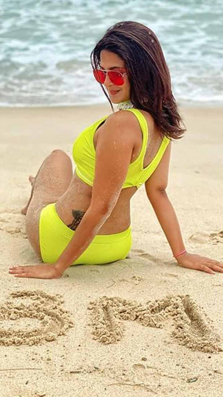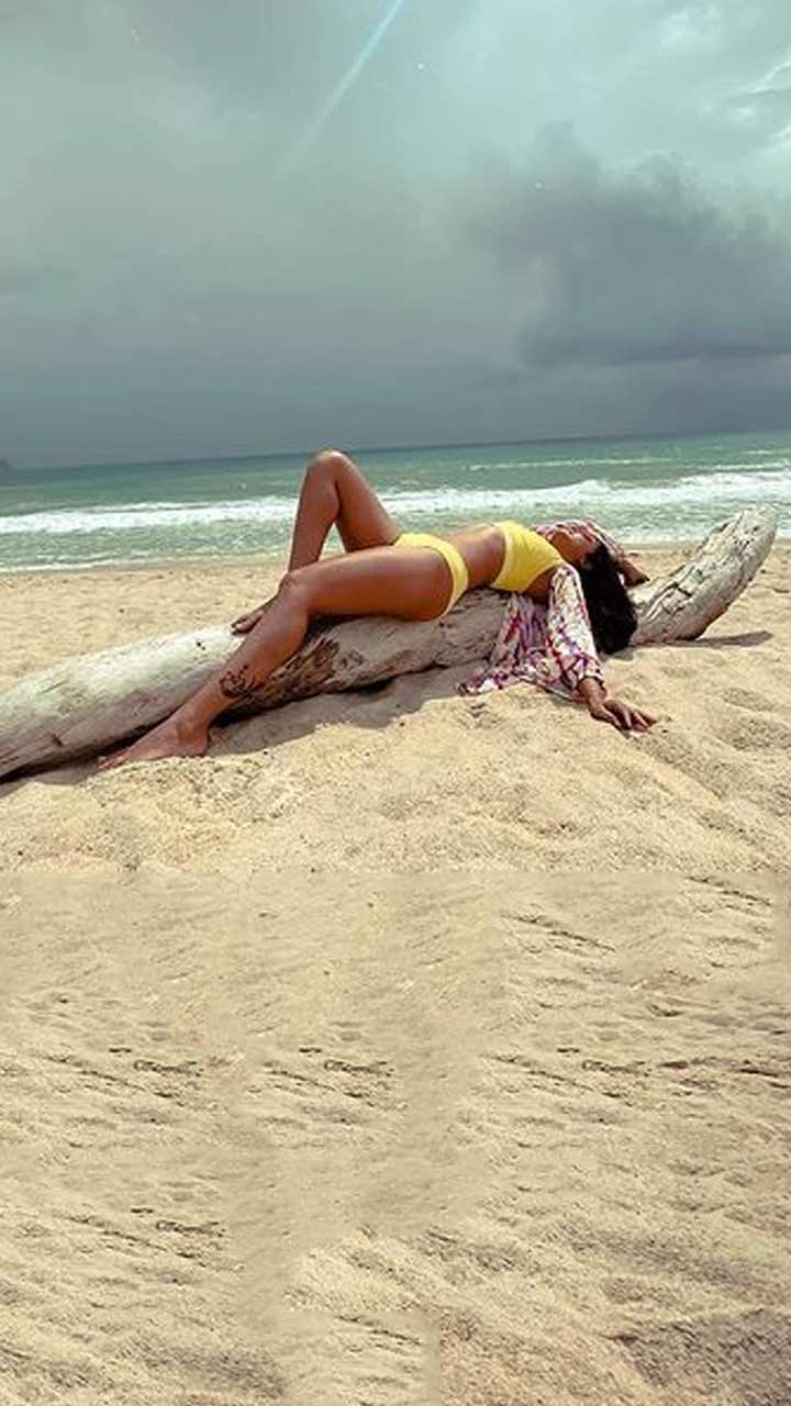 इस तस्वीर में एक्ट्रेस येलो कलर की बिकिनी में समंदर किनारे सन बार्थ लेती नजर आ रही हैं।