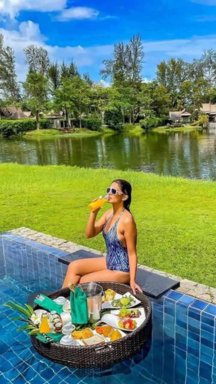 इस तस्वीर में एक्ट्रेस पूल में ब्लू कलर की मोनोकिन पहने पोज देत रही हैं।