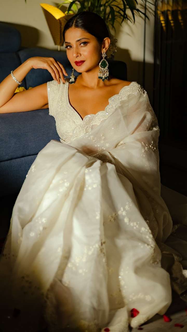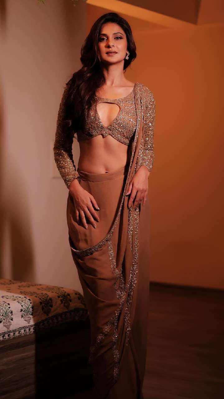 एक्ट्रेस ने बोल्ड और डिजाइनर ब्लाउज के साथ शिमरी साड़ी कैरी की है, जो लुक को काफी अट्रैक्टिव और एलिगेंट बना रही है। आप इसे मेसी बन हेयर स्टाइल के साथ स्टाइल करें।