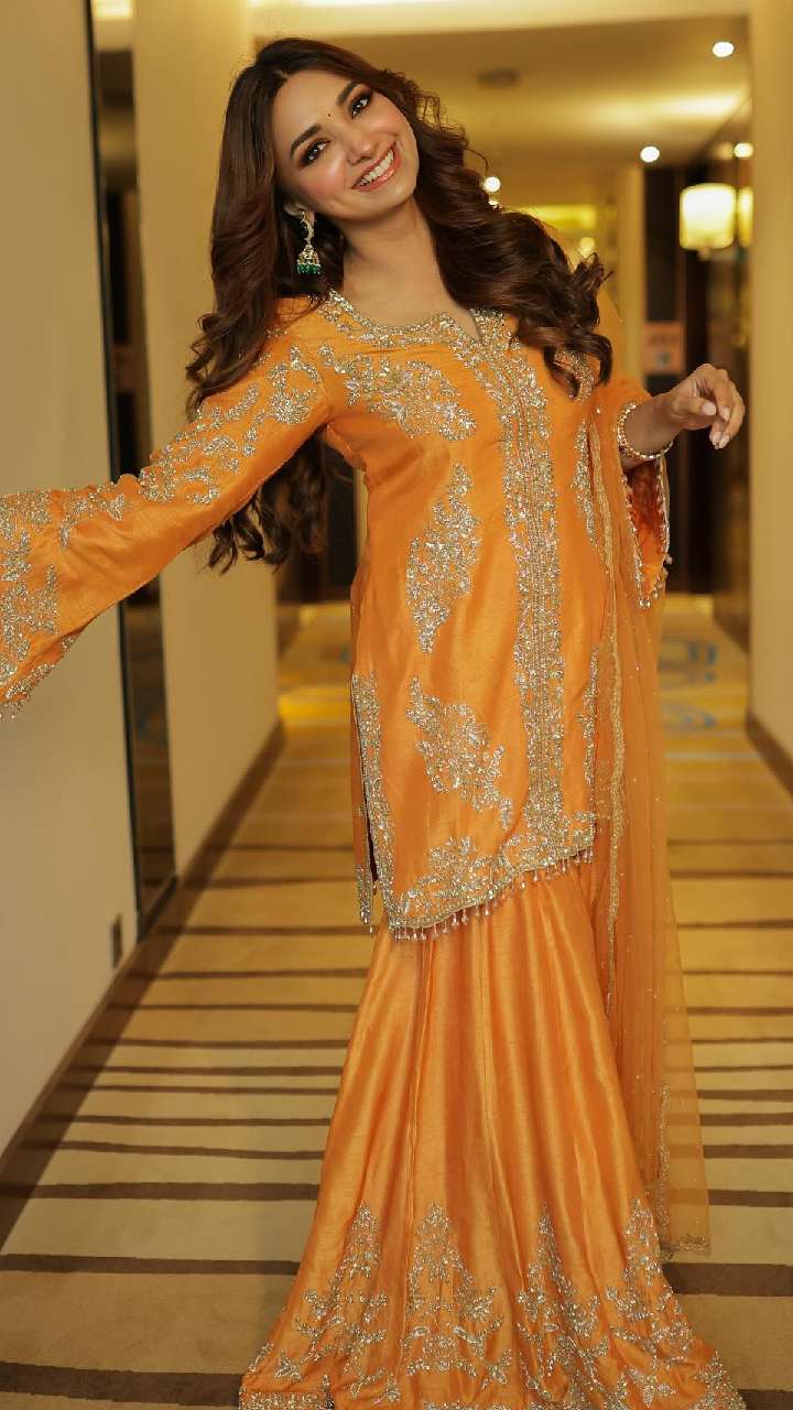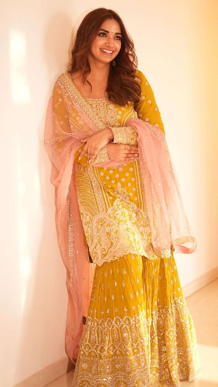 इस हैवी वर्क वाले साटन फेब्रिक येलो सूट में एक्ट्रेस बेहद खूबसूरत लग रही हैं। आउटफिट के साथ उन्होंने मेकअप और सिंपल ओपन हेयर स्टाइल कैरी किया है।