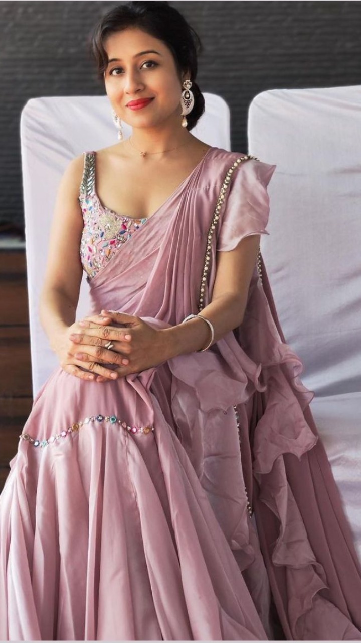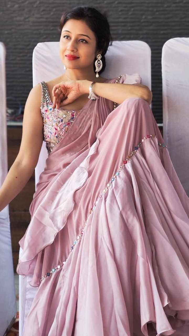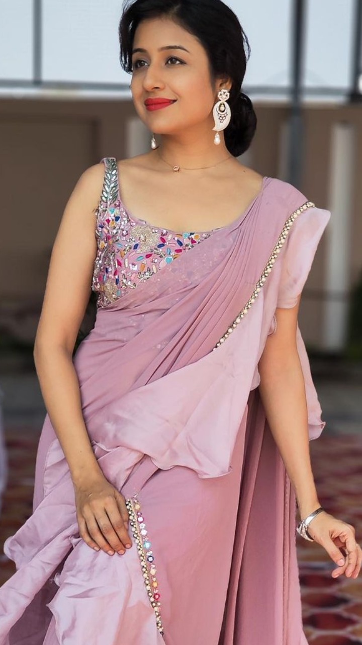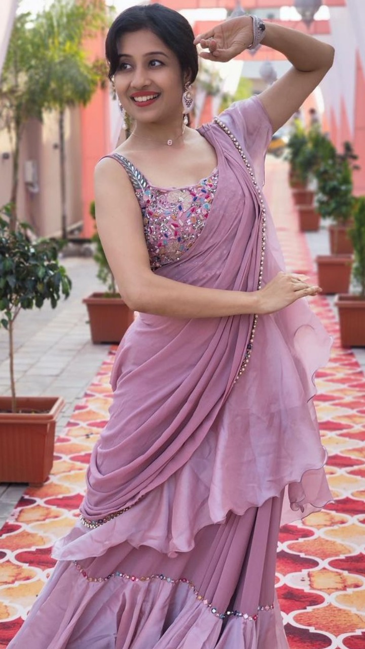 तस्वीर में एक्ट्रेस ने लिलेक कलर की रफल साड़ी और स्लीवलेस ब्लाउज पहना हुआ है। कानों में झुमका पहने हुए एक्ट्रेस का ये ओवरऑल लुक बेहद प्यारा लग रहा हैं।