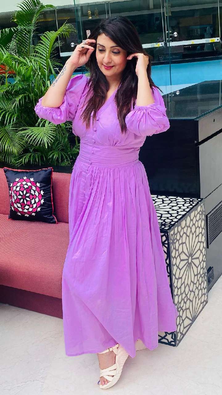 किटी पार्टी में मदर्स जूही परमार की सिंपल सोबर फ्रॉक स्टाइल कॉटन ड्रेस को स्टाइल कर सकती हैं। ये आपको क्लासी लुक देगा।
