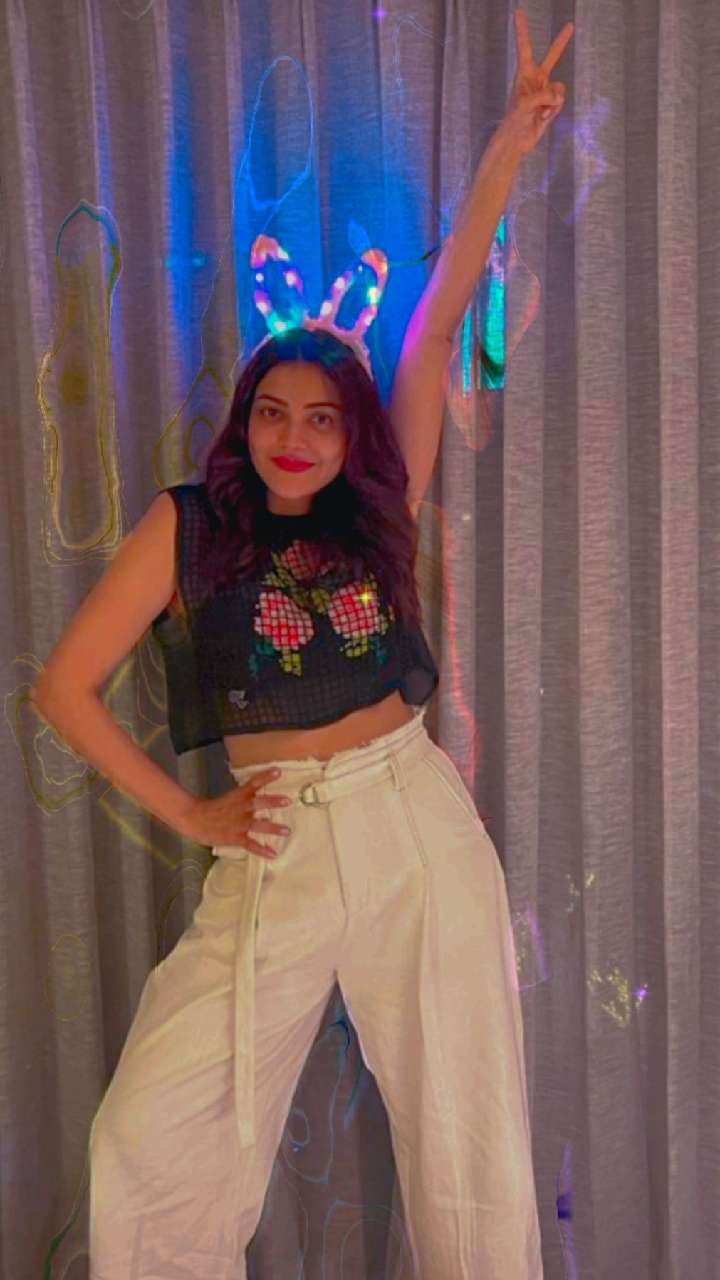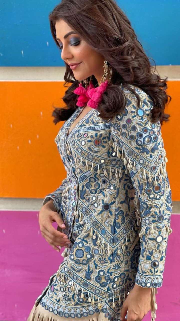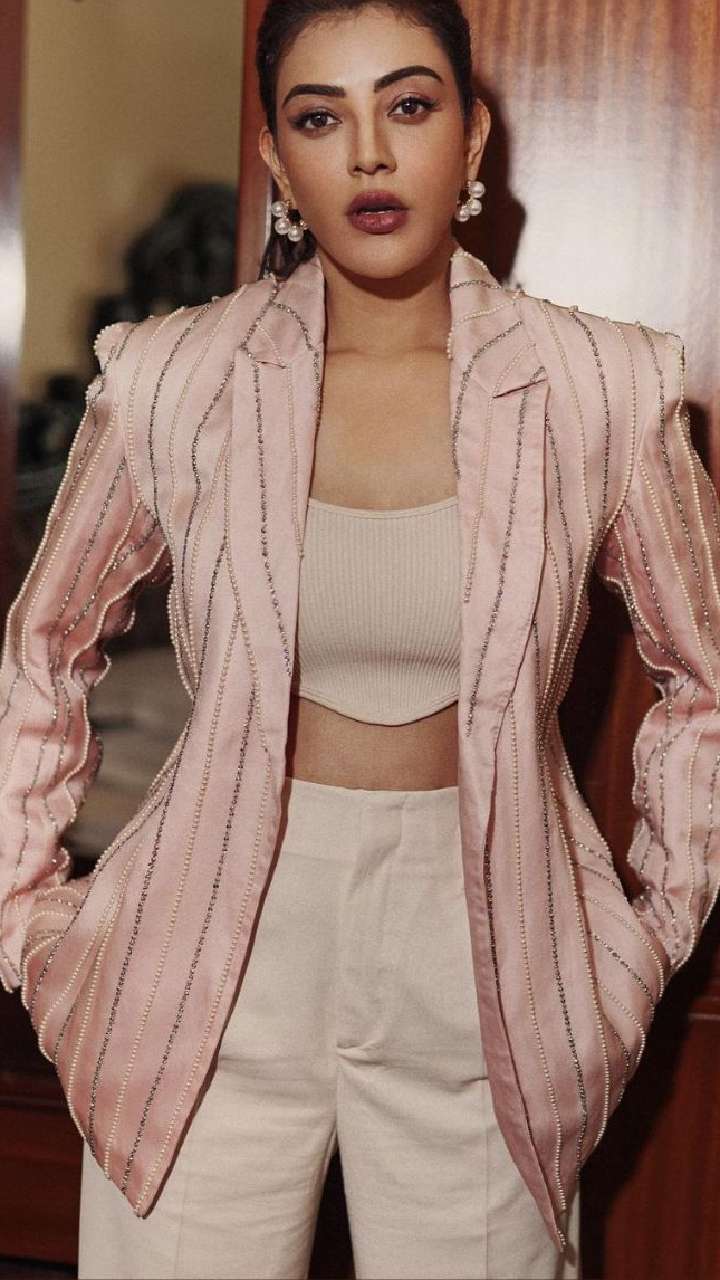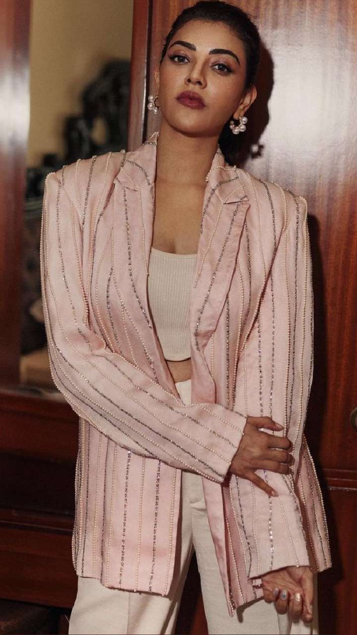 तस्वीर में काजल ने व्हाइट कलर की पैंट, ओवरसाइज्ड ब्रा और पिंक कलर का डिजाइनर कोट पहना हुआ हैं।