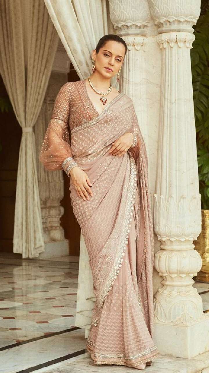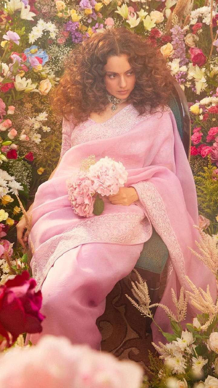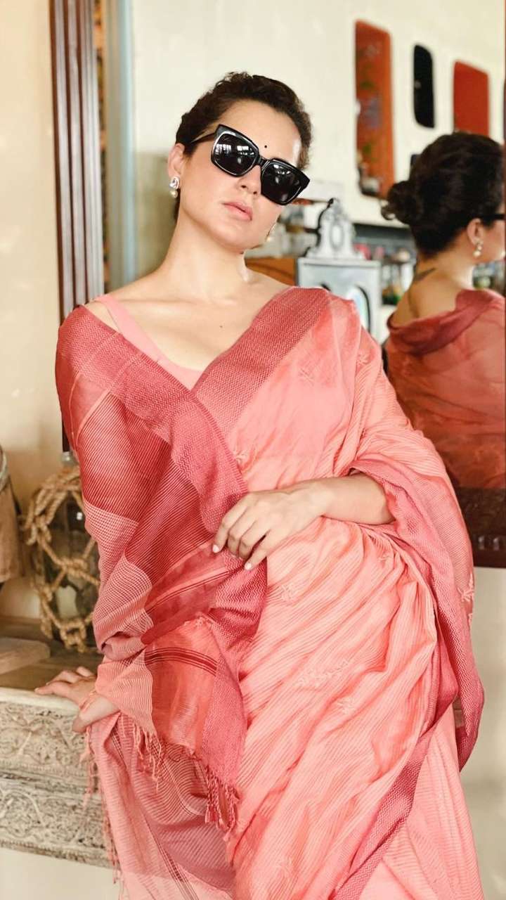 इस पिंक साड़ी में कंगना खूबसूरत लग रहीं हैं। पिंक कॉटन की साड़ी के साथ कंगना ने ओपन हेयर रखे हैं।