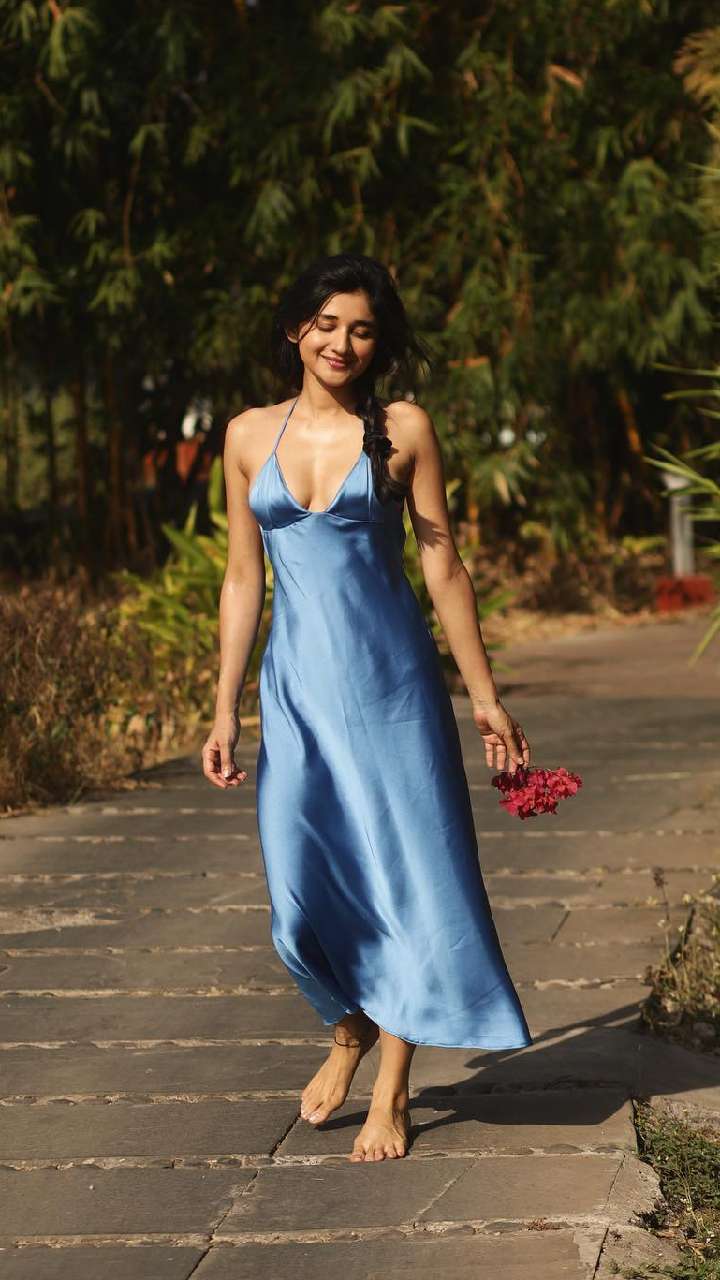 ब्लू कलर की ये हाई थाई स्लिट ड्रेस काफी ज्यादा शानदार लग रही है। फिलहाल हाई थाई स्लिट ड्रेसेज काफी ज्यादा ट्रेंड में चल रही हैं।