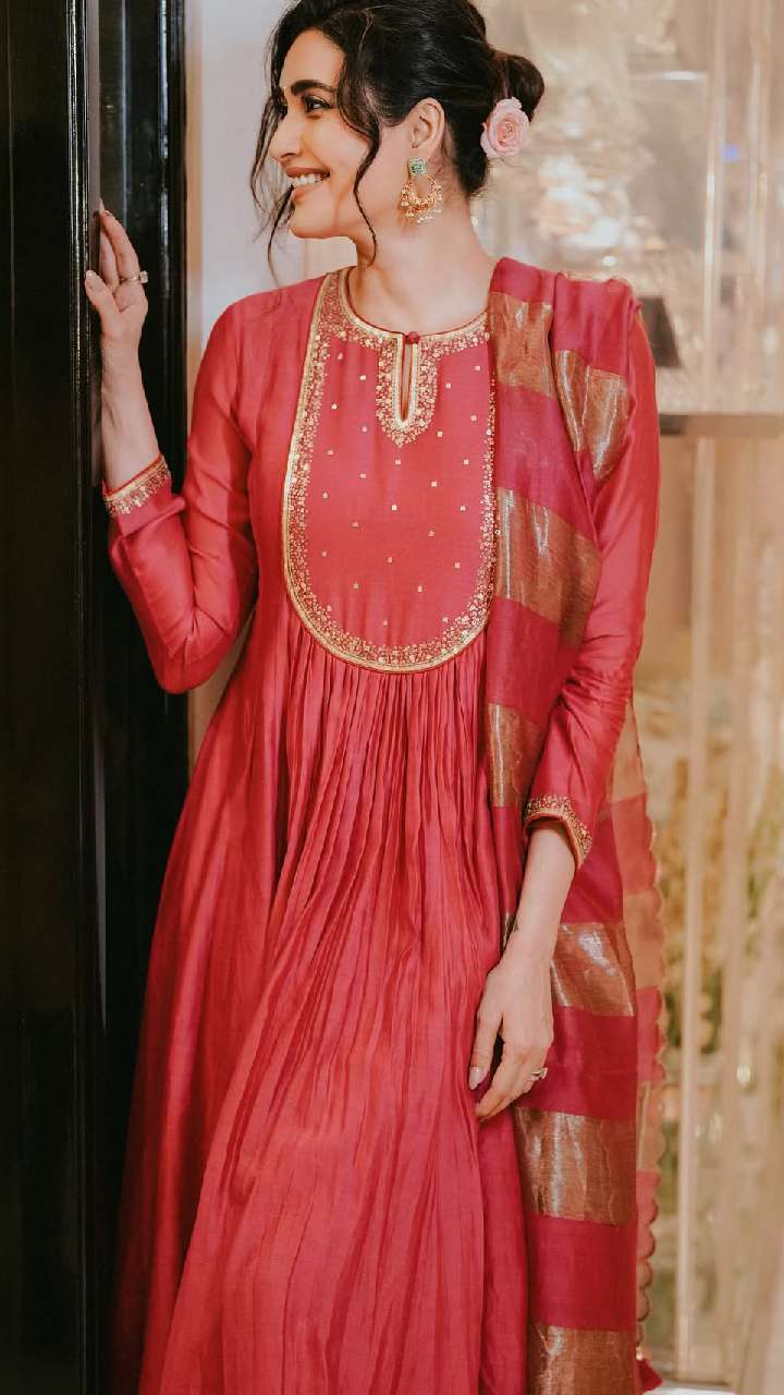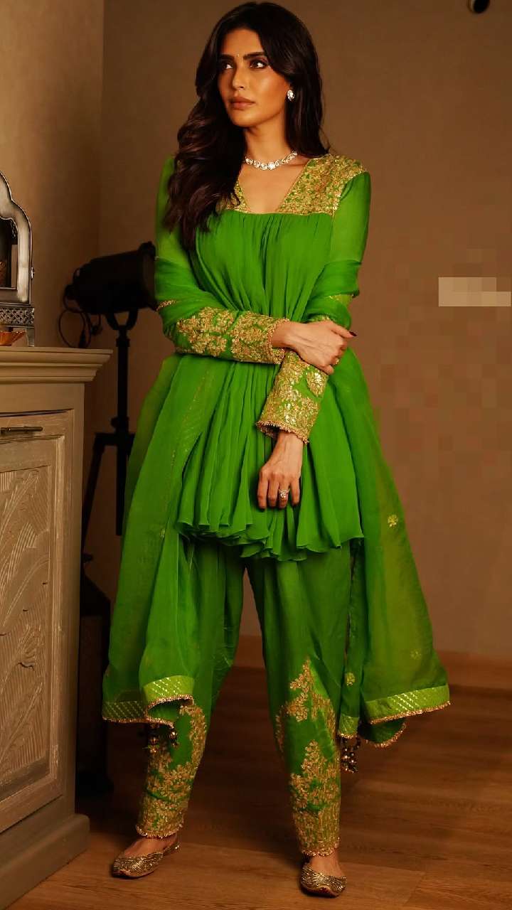 आजकल ऐसे सूट का फैशन फिर से वापस आ गया है। इसमें एक्ट्रेस काफी खूबसूरत लग रही हैं। इसका डिजाइन भी बेहद यूनिक और क्लासी हैं। Karishma के इस ऑउटफिट को आप किसी भी त्यौहार पर पहन सकती हैं।