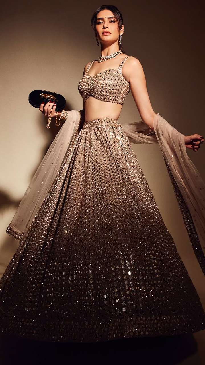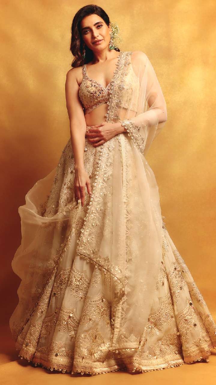 आजकल लड़कियां शादियों में लहंगे पहनना काफी पसंद करती हैं। एक्ट्रेस इस लहंगे में रानी जैसी लग रही हैं। आप भी इस लहंगे को शादी में लूज बन हेयर स्टाइल के साथ कैरी कर सकती हैं।
