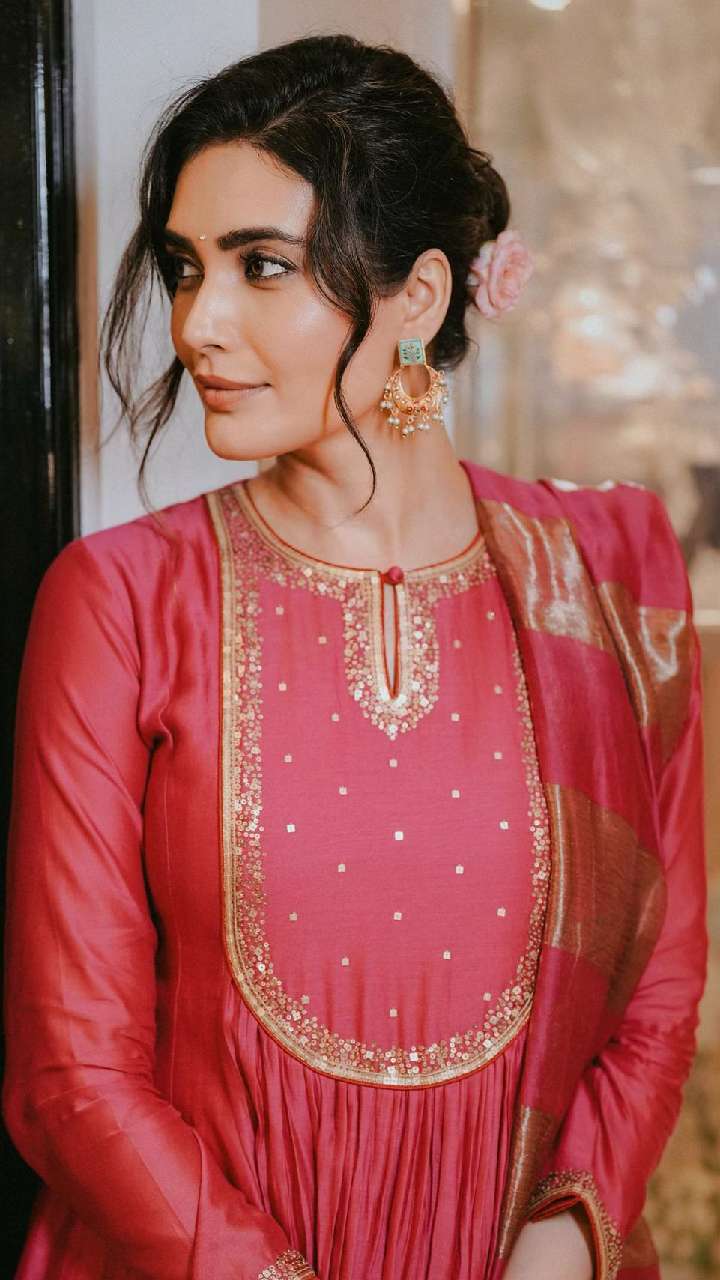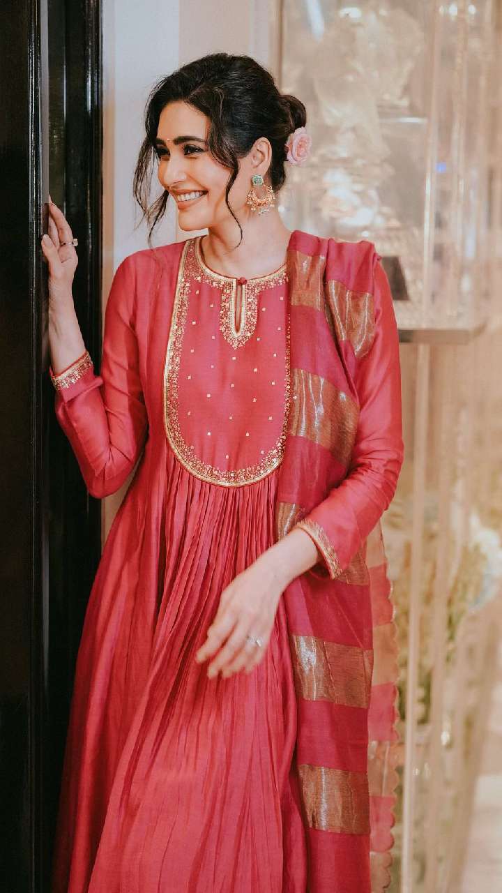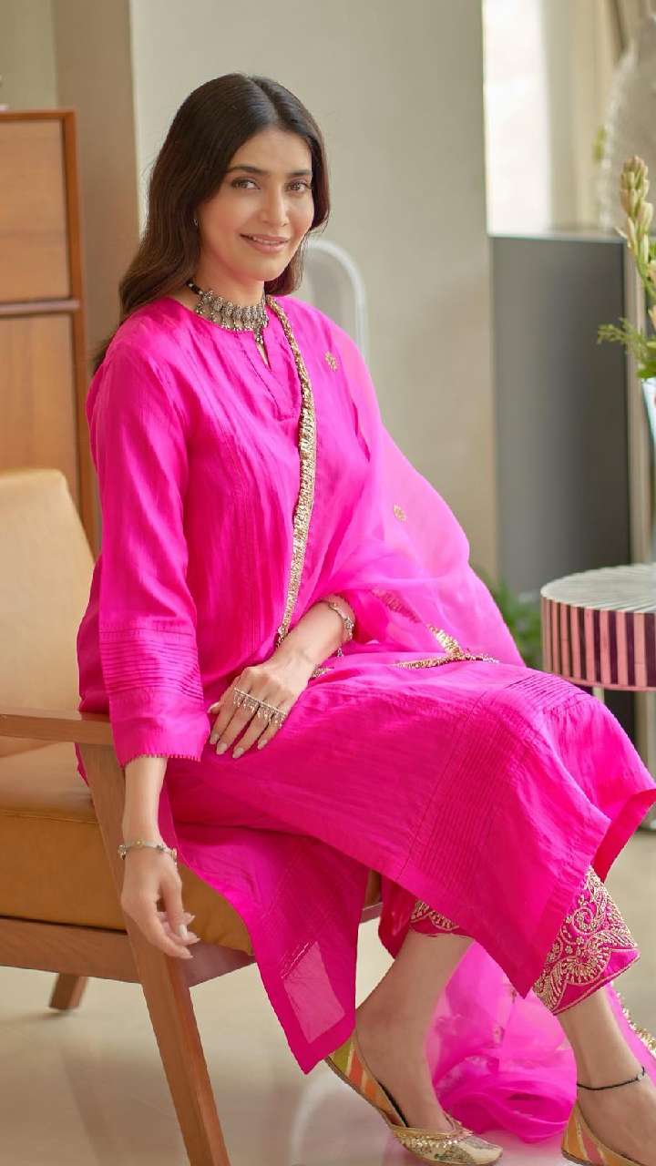 करिश्मा तन्ना ने इंस्टाग्राम पर पिंक कलर के प्लेन ए लाइन सूट गोल्डन पिंक शेड वाले दुपट्टे में अपना लेटेस्ट लुक शेयर किया है। जिसमें वो ब्यूटीफुल लग रही हैं।