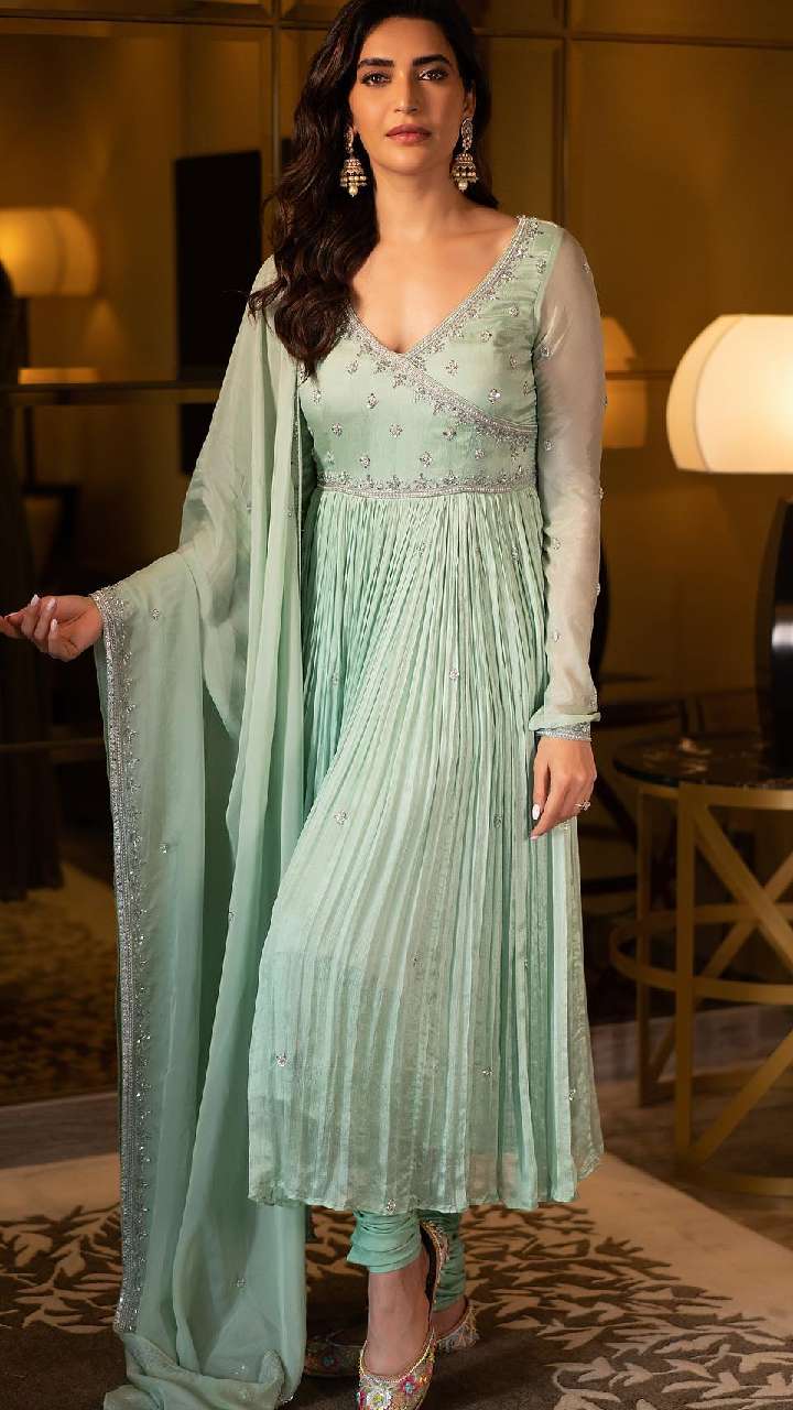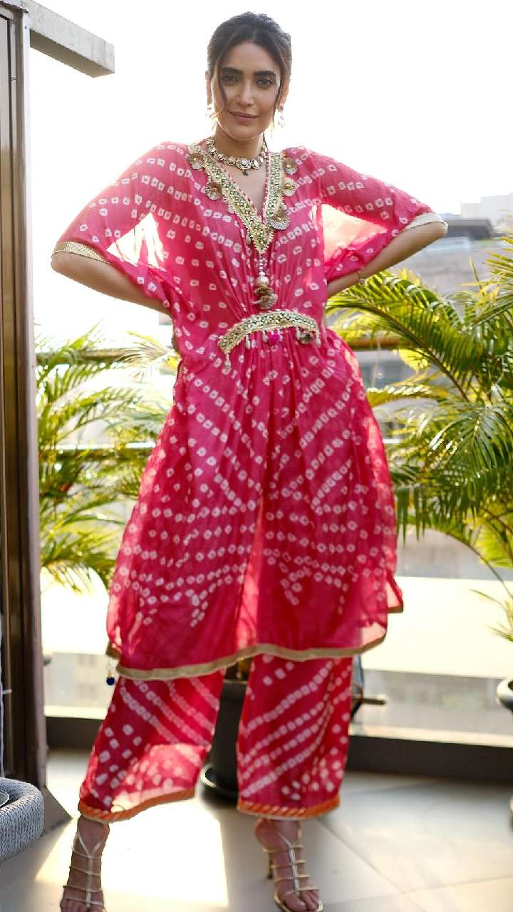 आप करिश्मा तन्ना के जैसा बंधेज काफ्तान स्टाइल सूट पहनकर त्योहारों पर अपने लुक में चार चांद लगा सकती हैं।