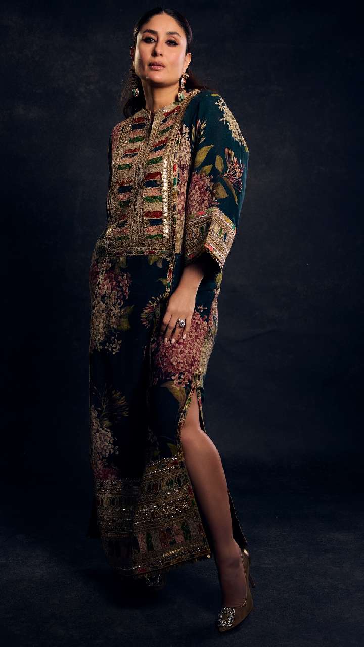 Kareena Kapoor की यह लॉन्ग कुर्ती ड्रेस आजकल काफी ट्रेंड में है। आप इसे मेसी बन या कर्ली हेयर स्टाइल के साथ पहन सकती हैं। यह आपको महफिल में हाइलाइट करेगा।