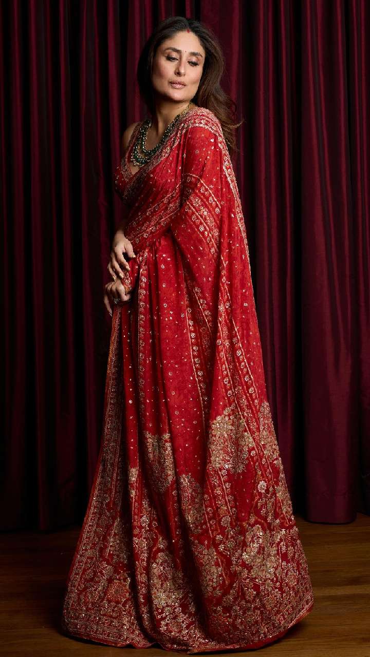 नई नवेली दुल्हन कपूर खानदान की बेटी Kareena से इंस्पायर हो सकती हैं। यह साड़ी देखने में काफी एलिगेंट लुक दे रही है। साथ ही, आप उसे न्यूड मेकअप के साथ पहन सकती हैं।