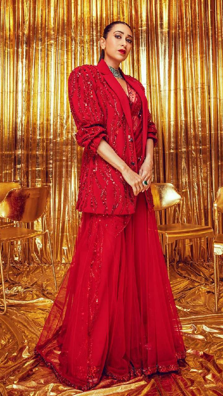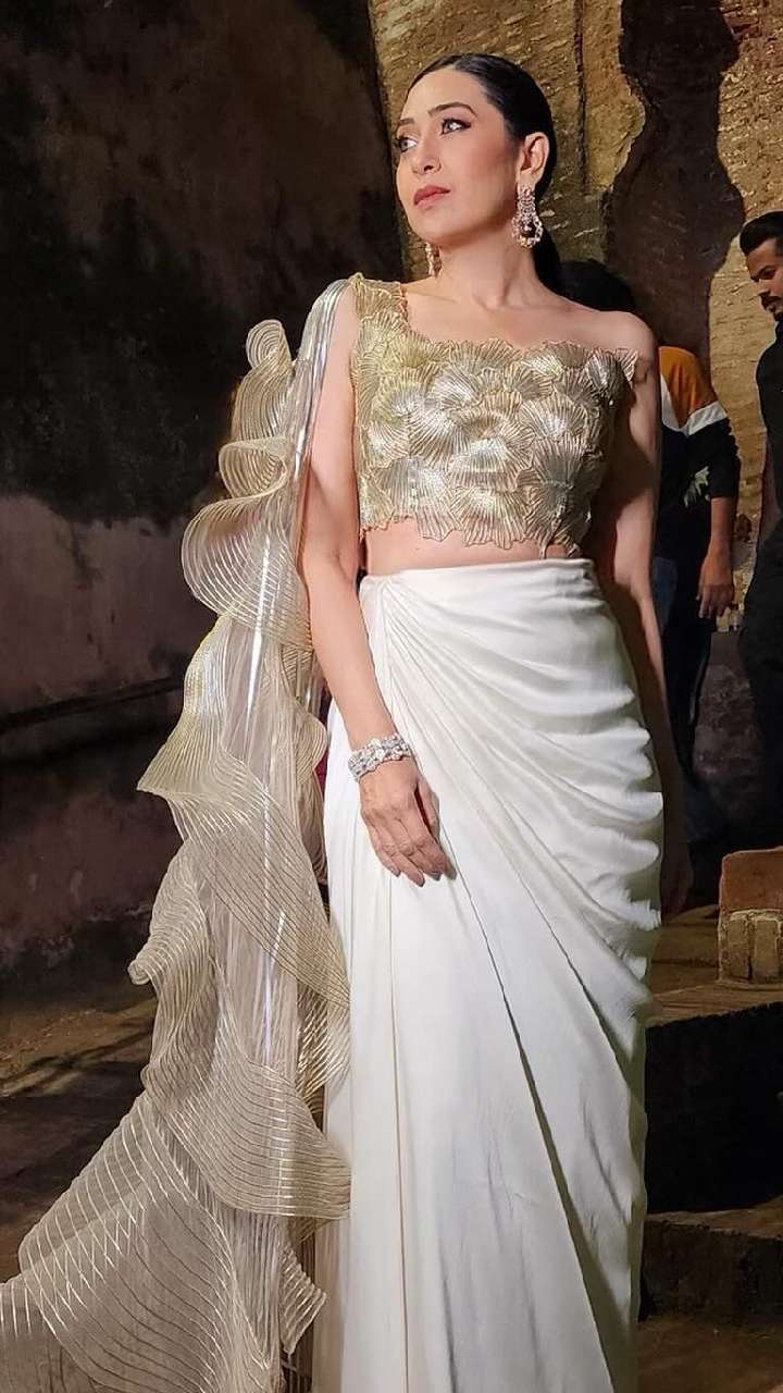 करिश्मा कपूर का ये साड़ी लुक भी काफी ज्यादा स्टाइलिश और डिफरेंट है। एक्ट्रेस ने साड़ी के साथ क्रेप कैरी किया है।