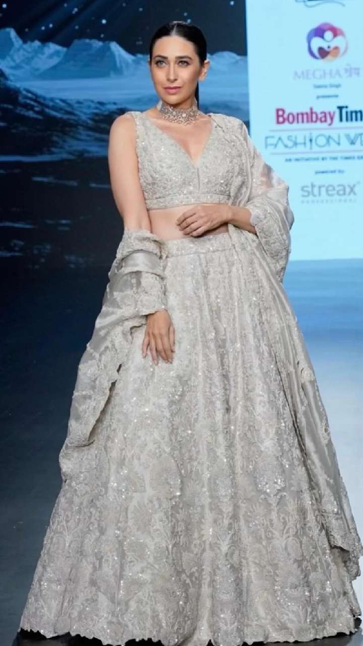 अगर आप अपने संगीत में लहंगा कैरी करना चाहती हैं तो आप करिश्मा कपूर के इस सिल्वर लहंगे को कैरी कर सकती हैं।