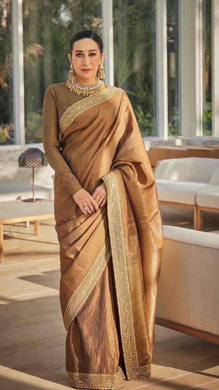 अगर आप अपने लुक को क्लासी बनाना चाहती हैं तो आप करिश्मा कपूर की तरह ही गोल्डन साड़ी को पहन सकती हैं।