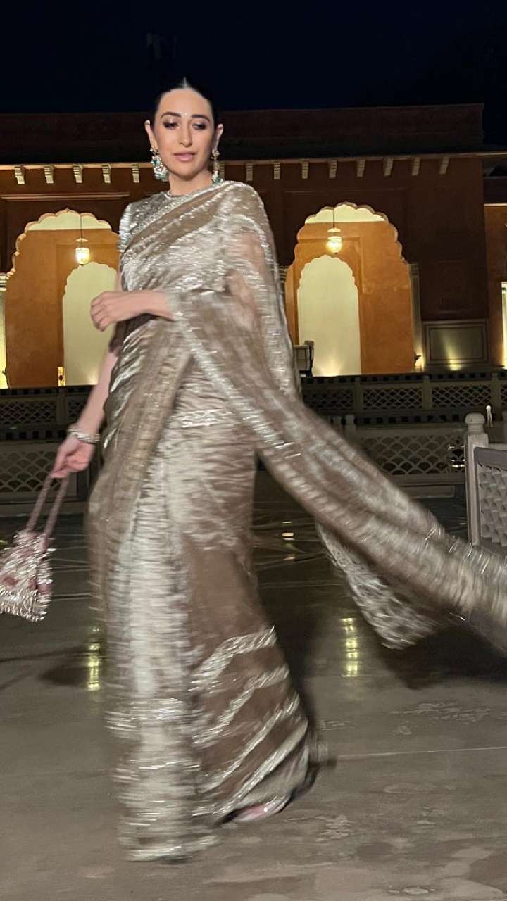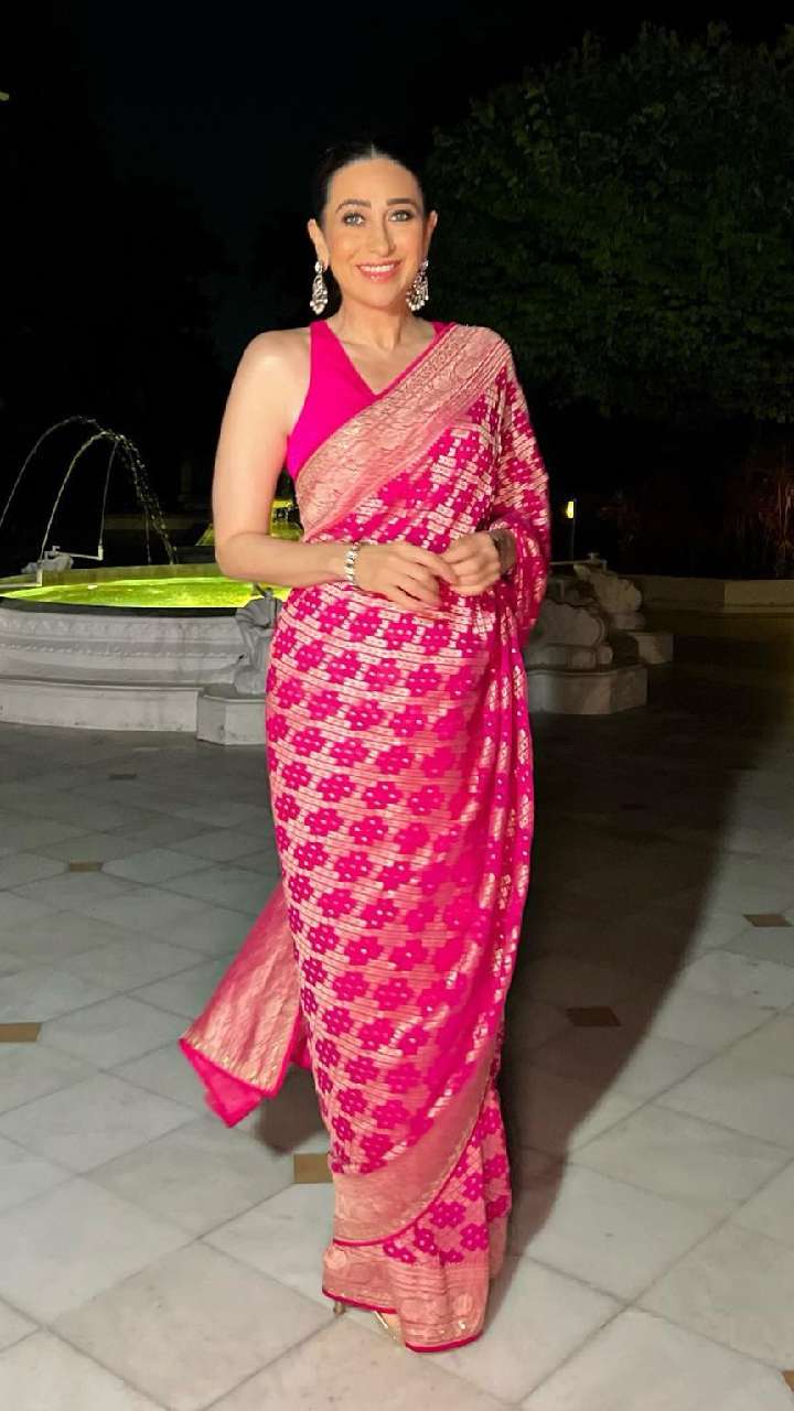 पिंक कलर की सिल्क साड़ी में करिश्मा कपूर का लुक काफी ज्यादा शानदार लग रहा है। आप व्रत के दिन सिल्क साड़ी पहन सकती हैं।
