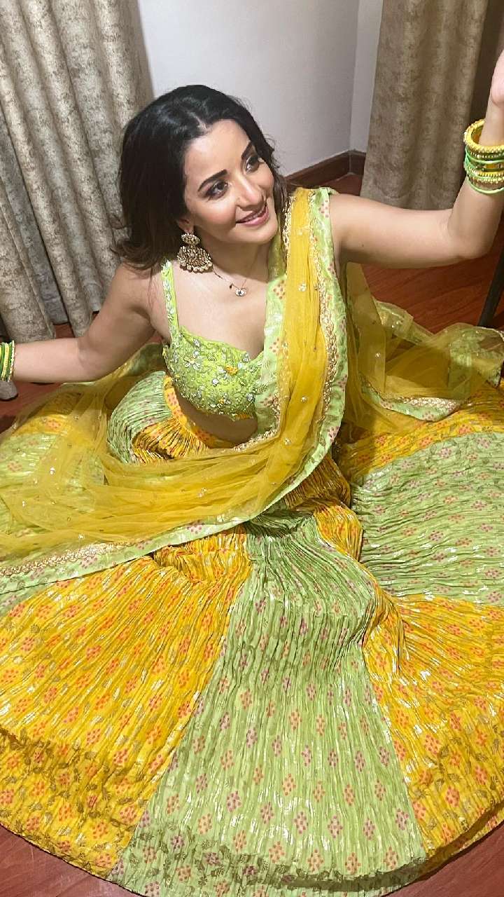 मोनालिसा ने इस सिंपल मेहंदी ग्रीन सेल्फ प्रिंट लहंगे को शिमरी स्ट्रैपी चोली से गॉर्जियस लुक दिया है।
