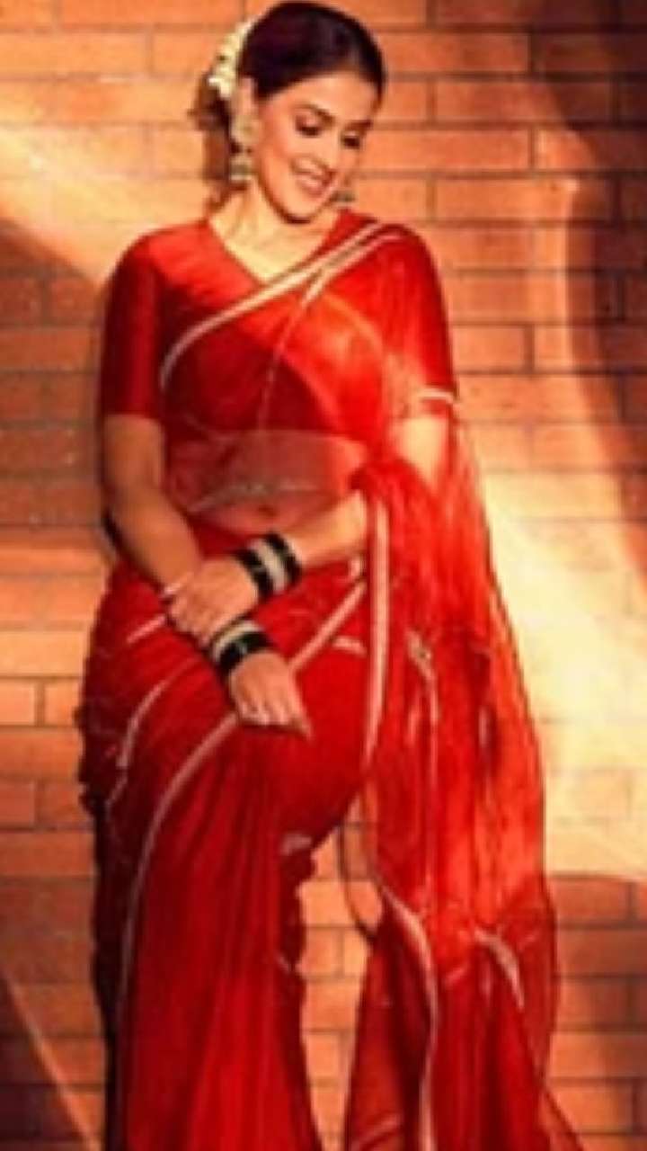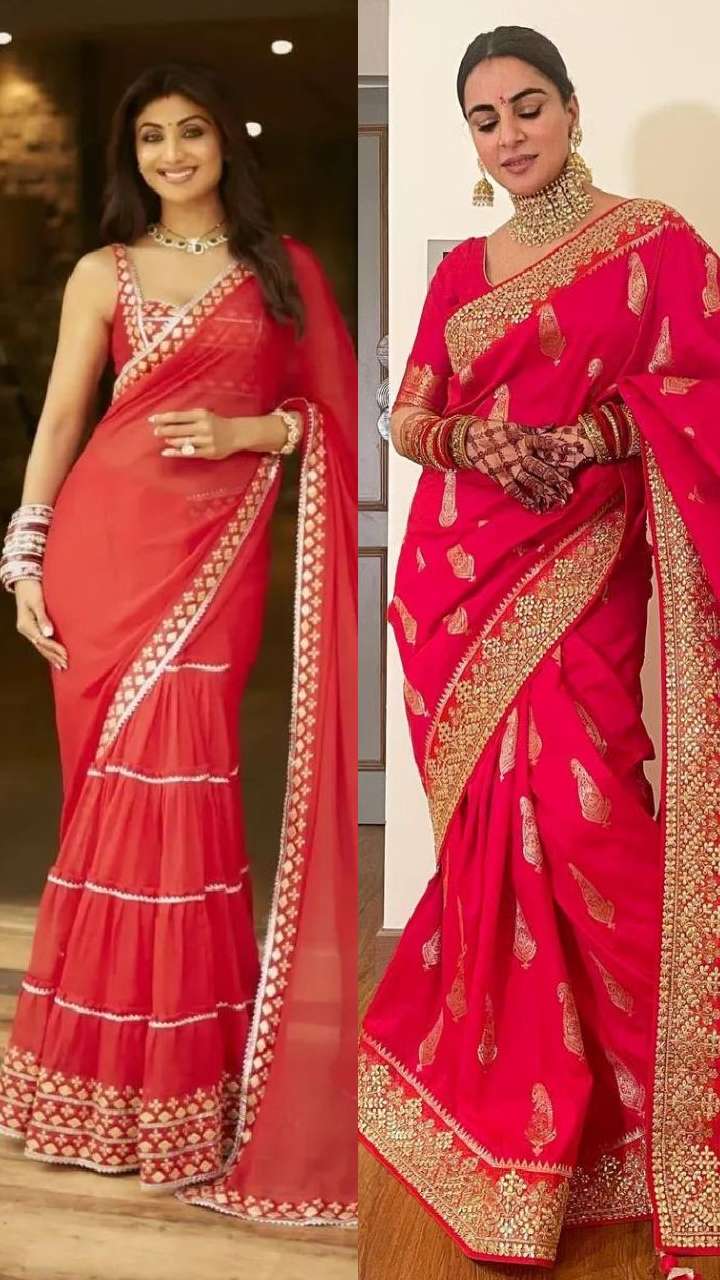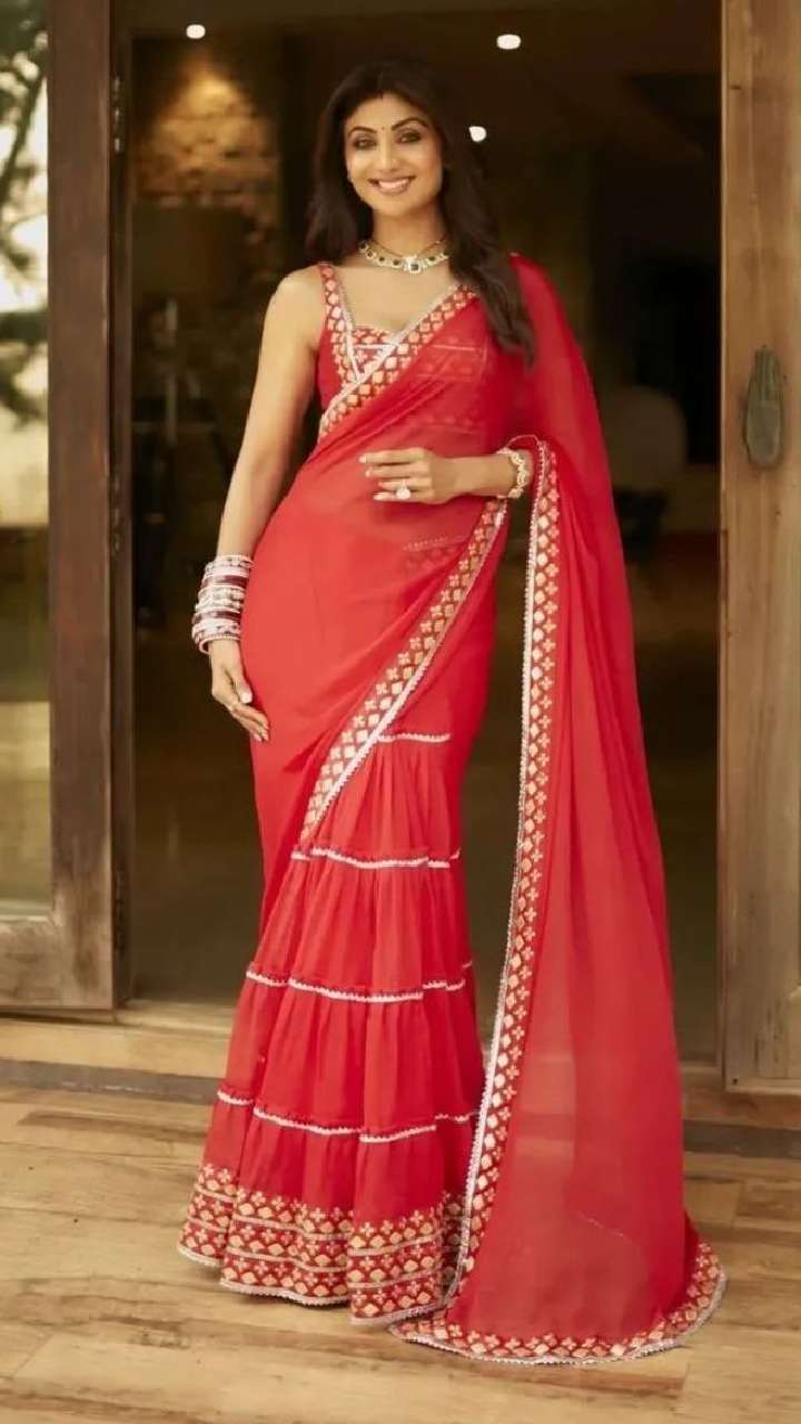 रेड कलर की साड़ी में शिल्पा शेट्टी का ये लुक करवा चौथ के लिए बिल्कुल परफेक्ट है। एक्ट्रेस का हर लुक बेहद खास होता है।