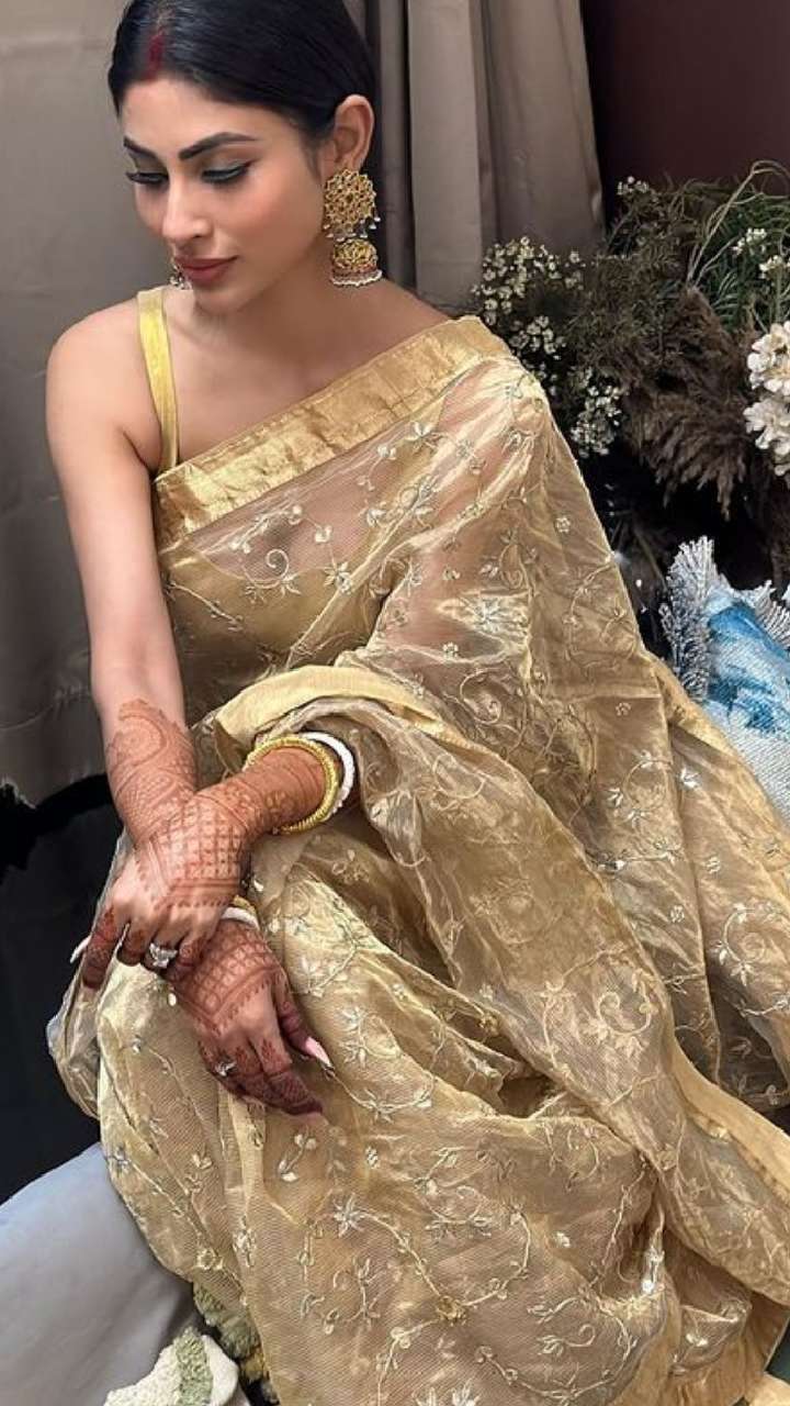 अगर आप इस करवा चौथ कुछ डिफरेंट ट्राई करना चाहती हैं तो आप मौनी रॉय की तरह गोल्डन कलर की साड़ी भी कैरी कर सकती हैं।