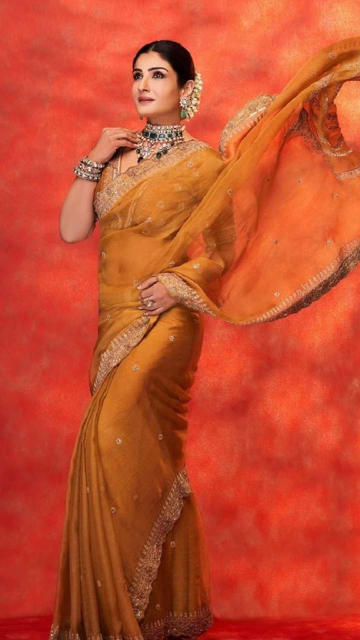 अगर आप लाल कलर के अलावा कोई और कलर ट्राई करना चाहती हैं तो रवीना टंडन की इस ऑरेंज साड़ी को आप कैरी कर सकती हैं।