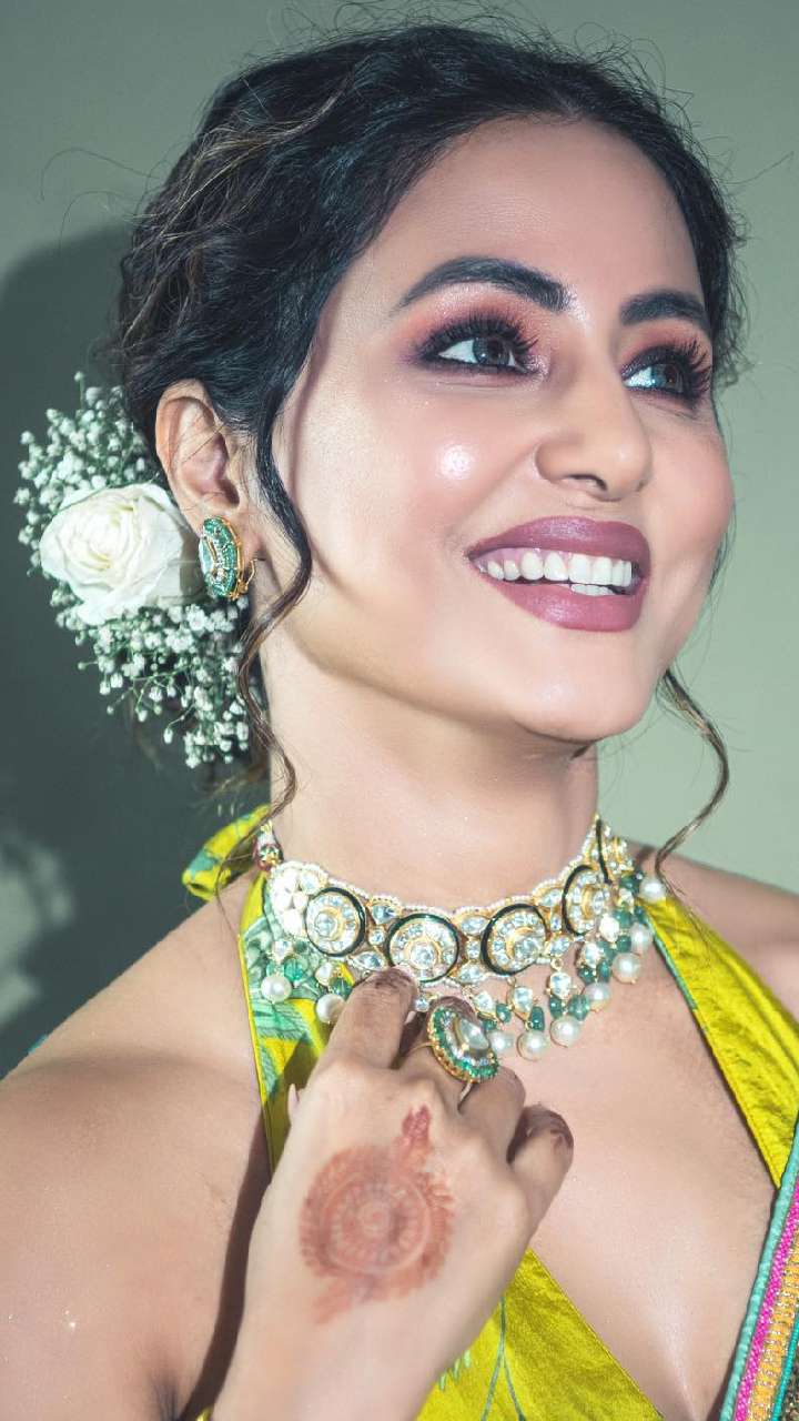 यंग गर्ल्स हिना खान की तरह लहंगे के साथ ओपन लाइट कर्ल विद टियारा लुक को कॉपी कर सकती हैं।