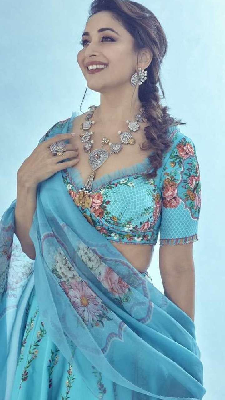 माधुरी ने लहंगे के साथ मेसी ब्रेड हेयर स्टाइल को पेयर किया है। आप भी इस लुक को फॉलो कर सकती हैं।