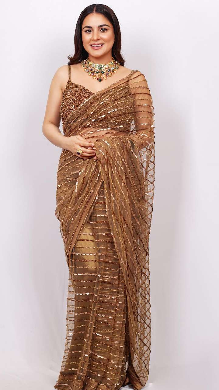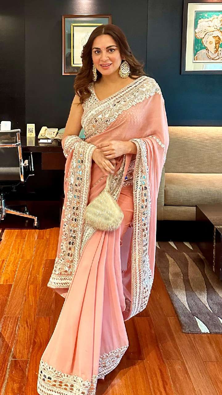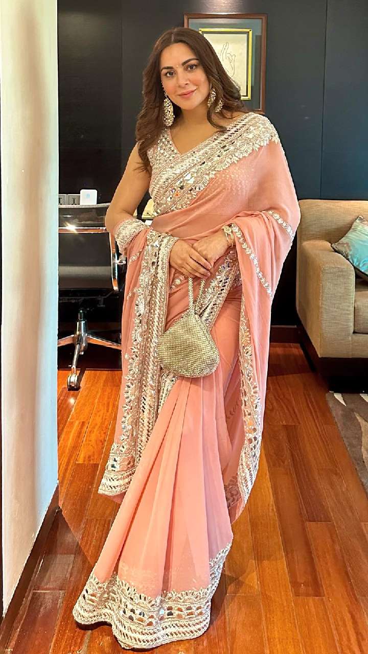 मिरर वर्क साड़ी भी आप इस करवा चौथ कैरी कर सकती हैं। एक्ट्रेस की ये पिंक मिरर वर्क साड़ी लुक भी शानदार है।